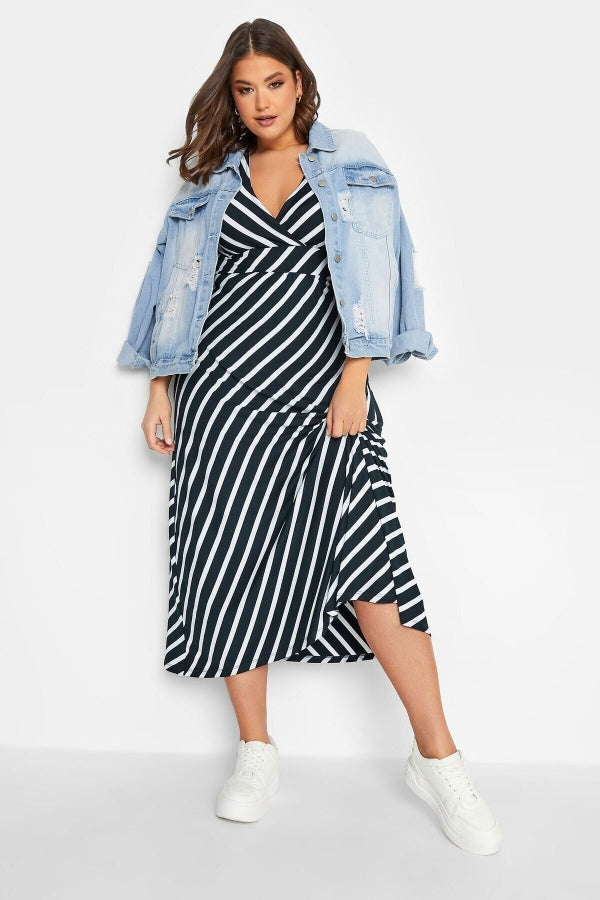 Büyük Beden Çizgili V Yaka Yarım Kollu Midi Boy Elbise 301021