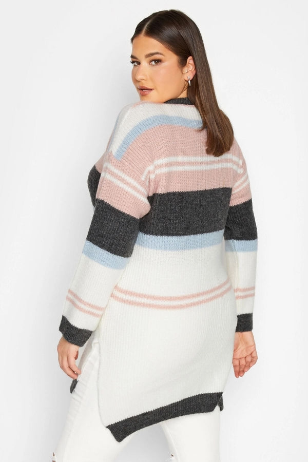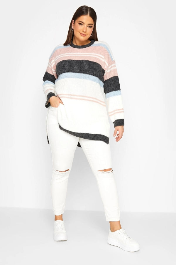 Büyük Beden Çizgili Yuvarlak Yaka Yırtmaç Detaylı Triko Kazak 301827