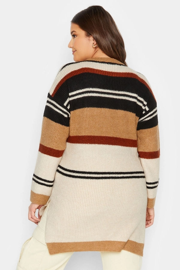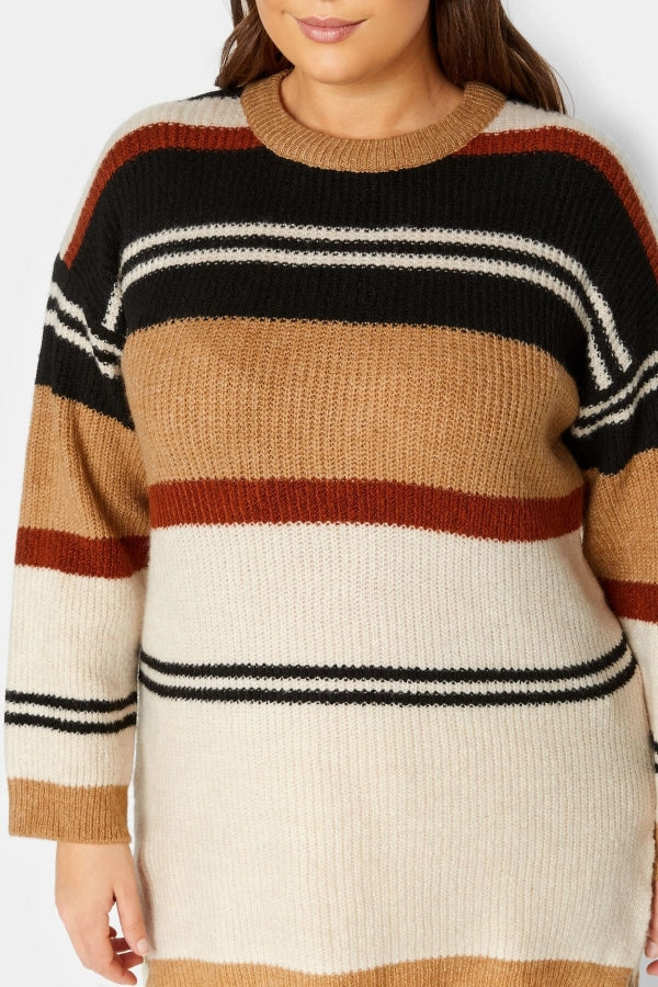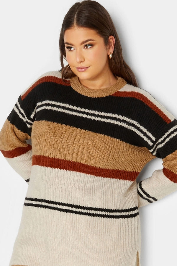 Büyük Beden Çizgili Yuvarlak Yaka Yırtmaç Detaylı Triko Kazak 301829