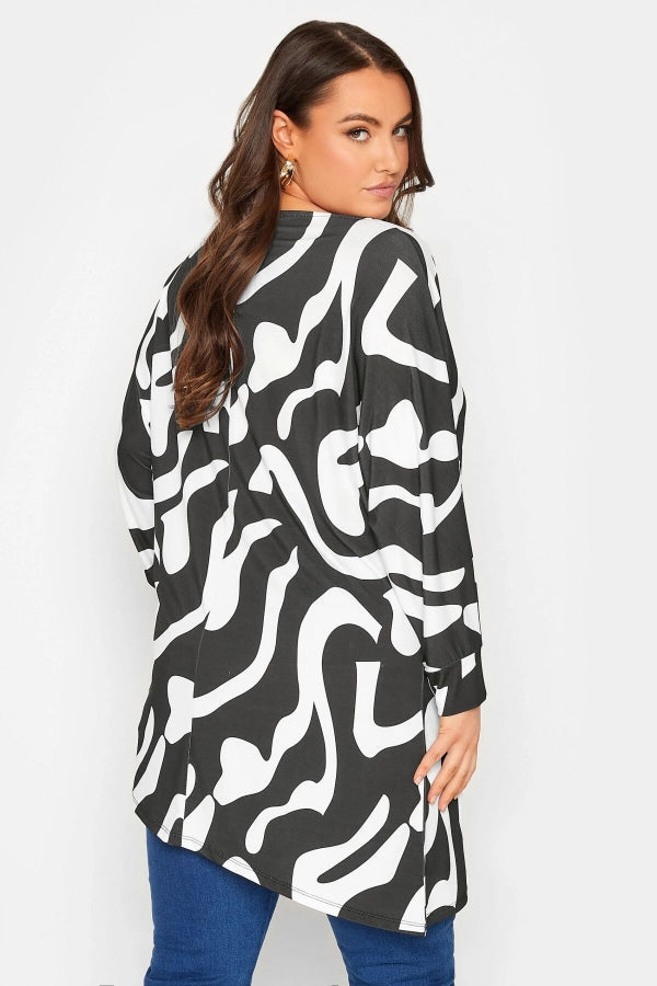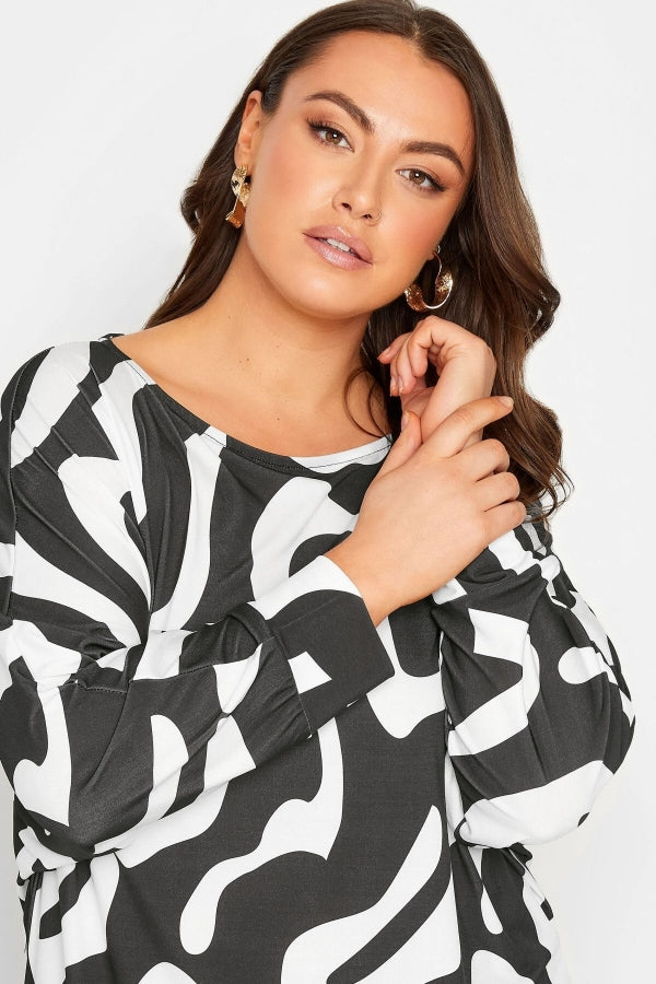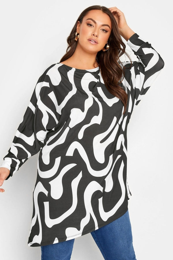 Büyük Beden Desenli Asimetrik Kesim Kayıkçı Yaka Uzun Kollu Bluz 302057