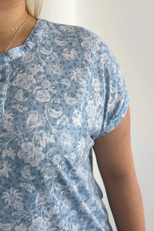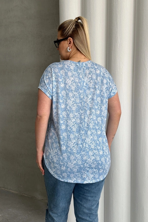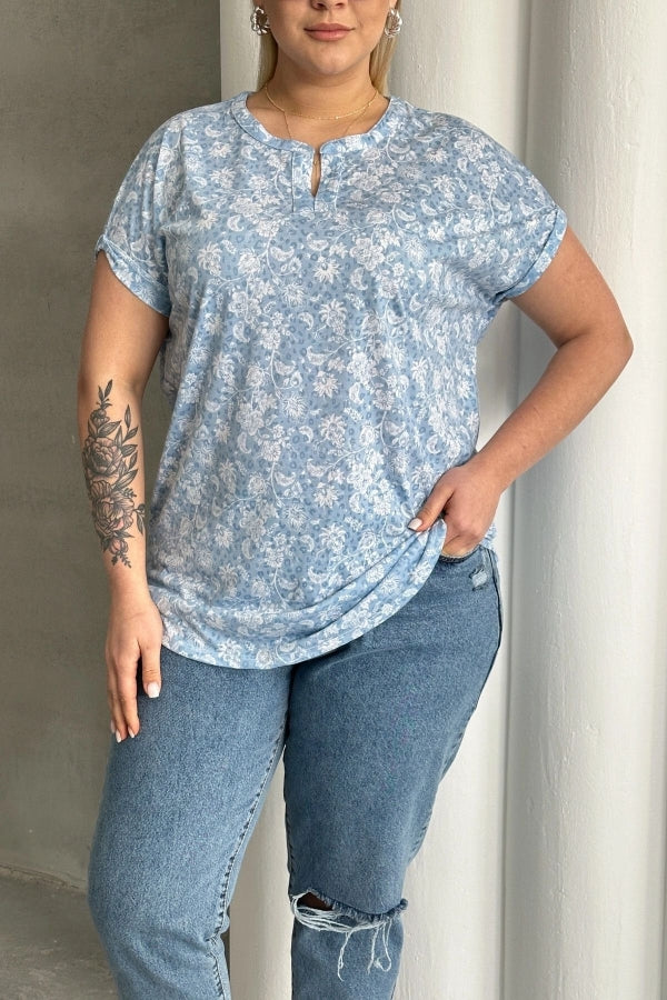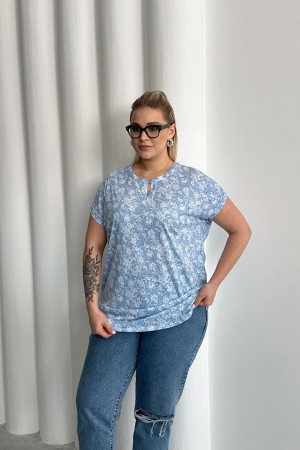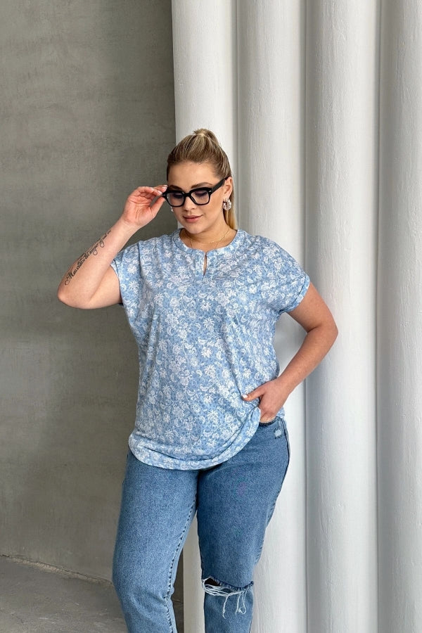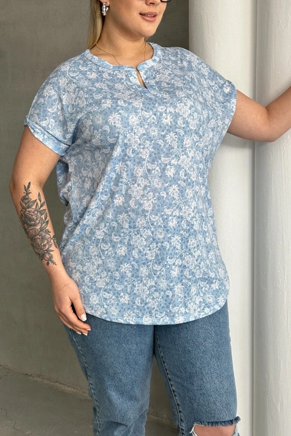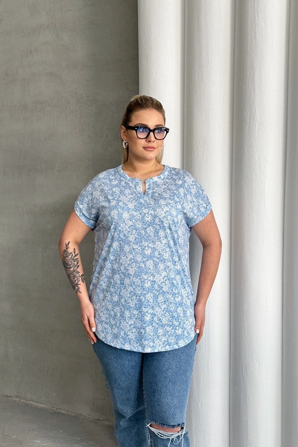 Büyük Beden Kısa Kollu Çentik V Yaka Desenli Bluz 97-79