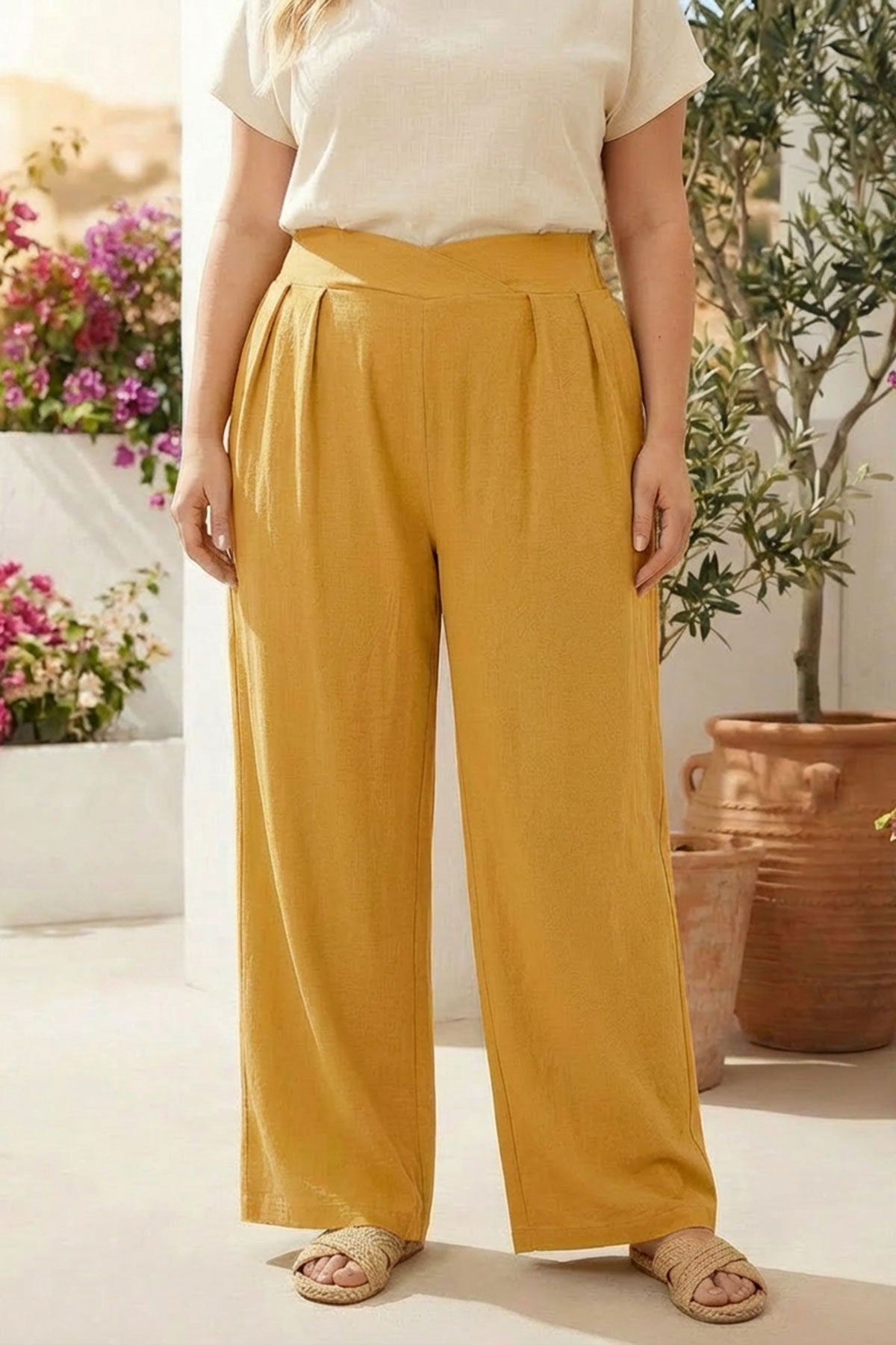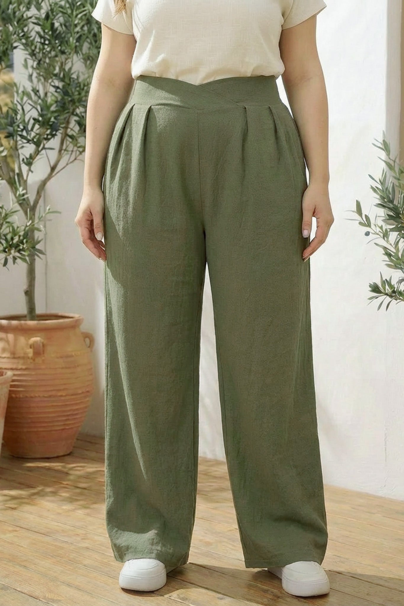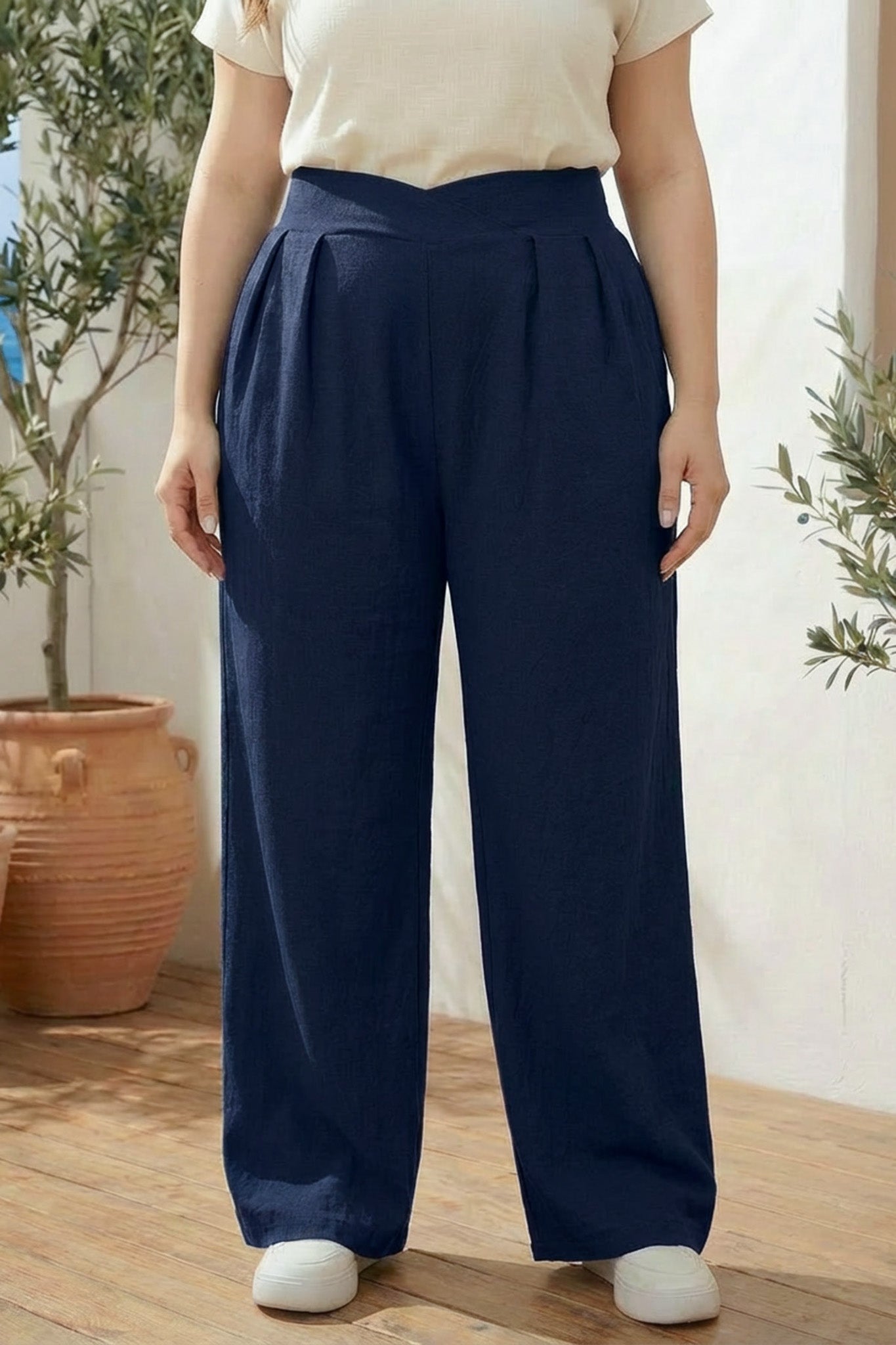 Model Detayı: Önü pileli, yüksek bel, yan cepli, geniş paça, fermuar ve düğme kapamalı.