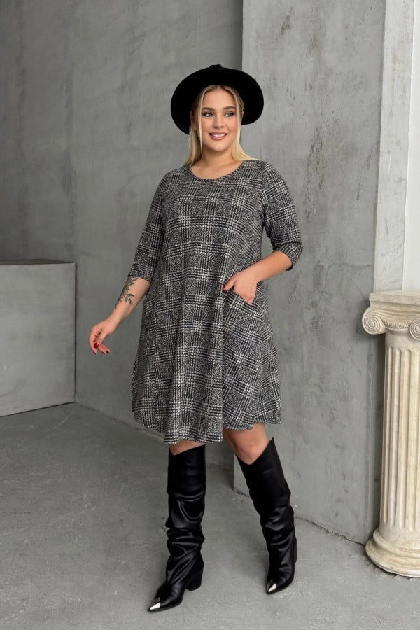 Model Detayı: Ekose Desenli, Bisiklet Yaka, Yarım Kol, Cepli, Asimetrik Kesim Elbise
