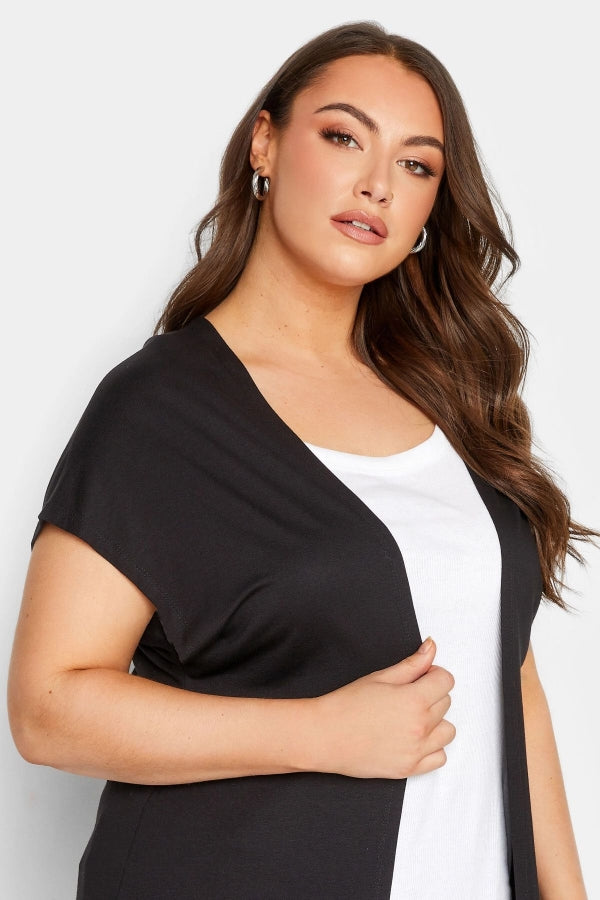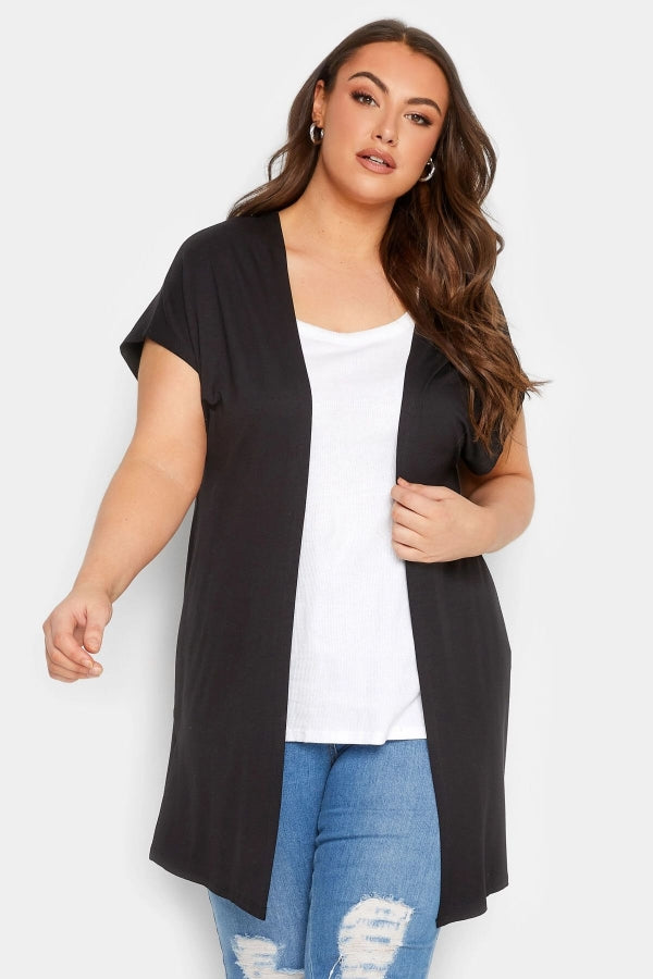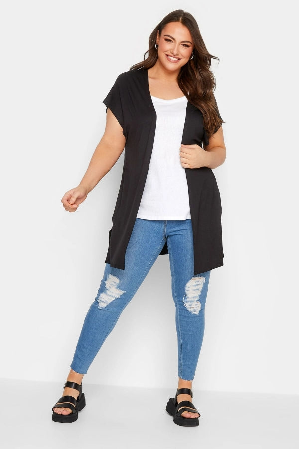 Büyük Beden Yırtmaç Detaylı Düğmesiz Esnek Kumaş Kısa Kollu Hırka 320879