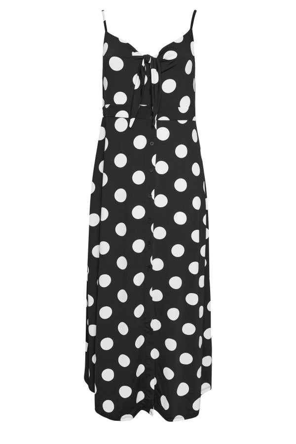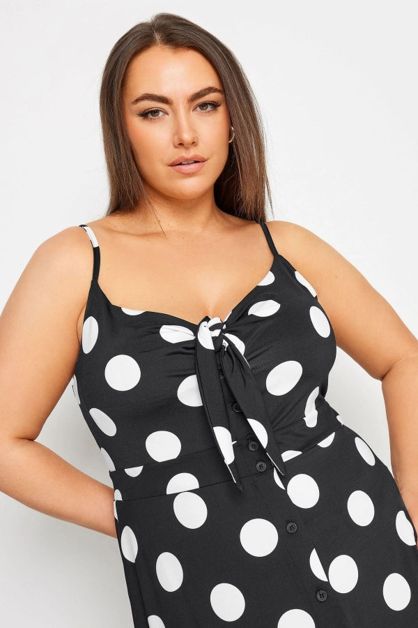 Büyük Beden Askılı Bağlama Detaylı Puantiyeli Düğmeli Yırtmaçlı Elbise 302378
