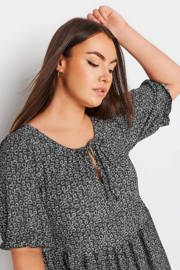 Büyük Beden Bağlama Detaylı Kolları Fırfırlı Çiçek Desenli Elbise 303187