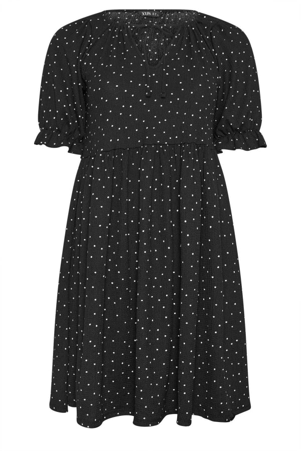 Büyük Beden Bağlama Detaylı Kolları Fırfırlı Puantiye Desenli Elbise 303150