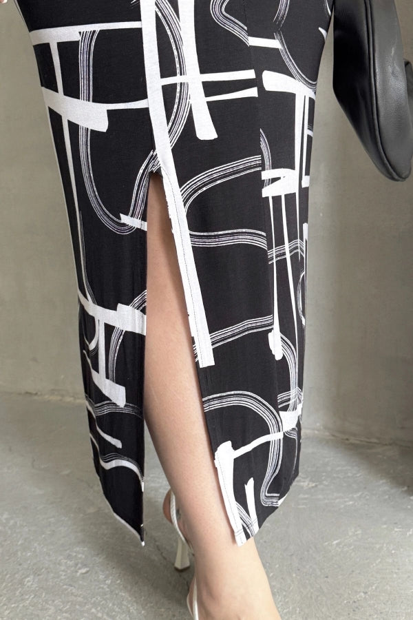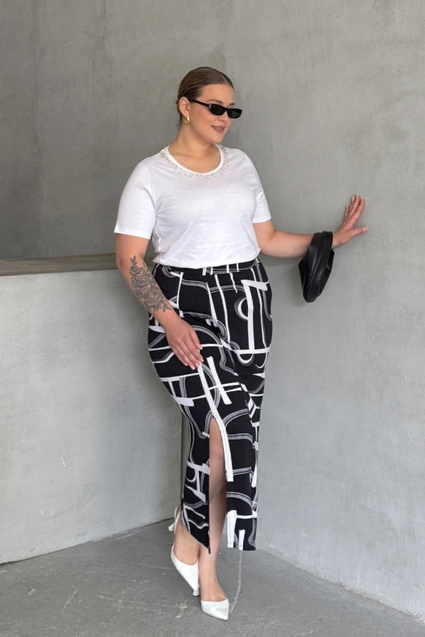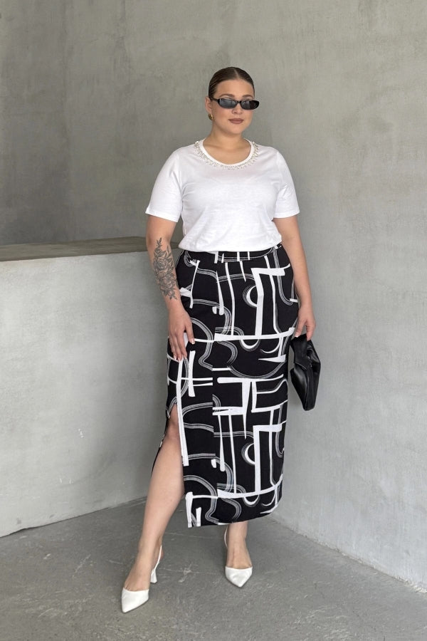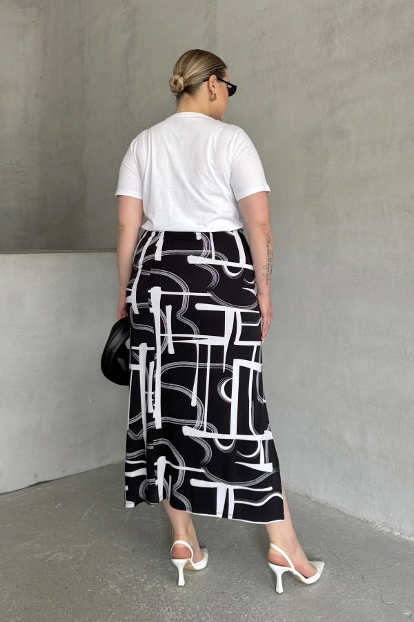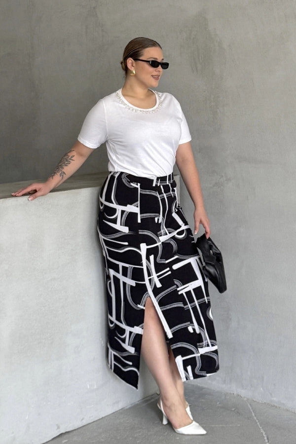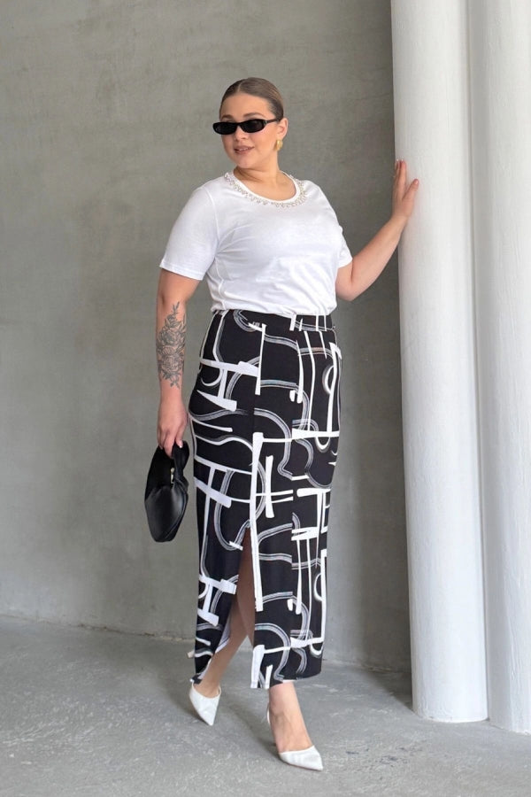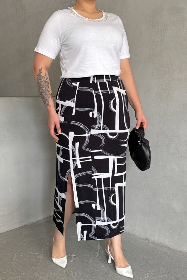 Büyük Beden Beli Lastikli Soyut Desenli Yırtmaç Detaylı Uzun Etek 98-120