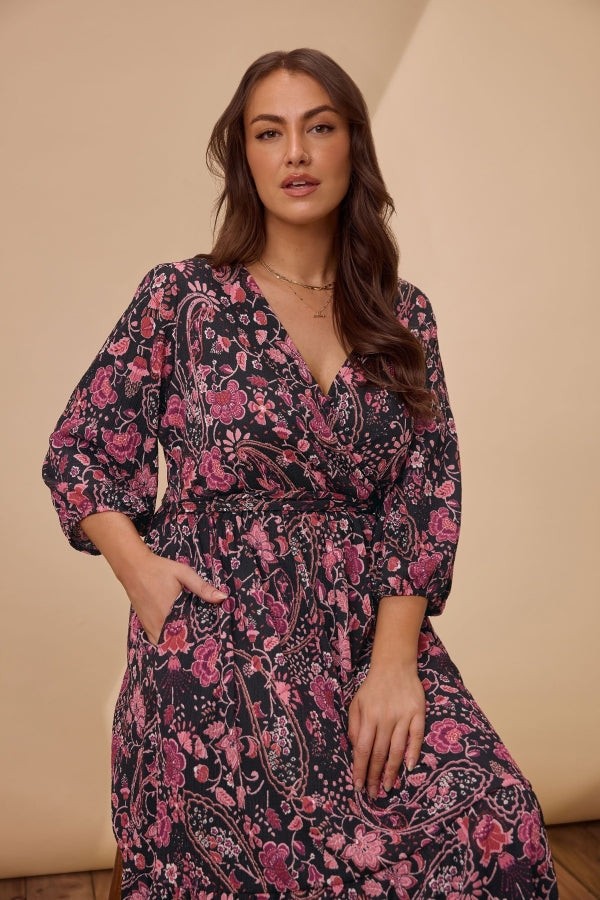 Büyük Beden Beli Lastikli V Yaka Desenli Uzun Anvelop Elbise 616311
