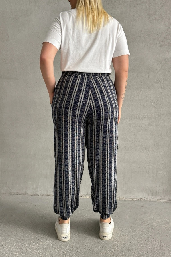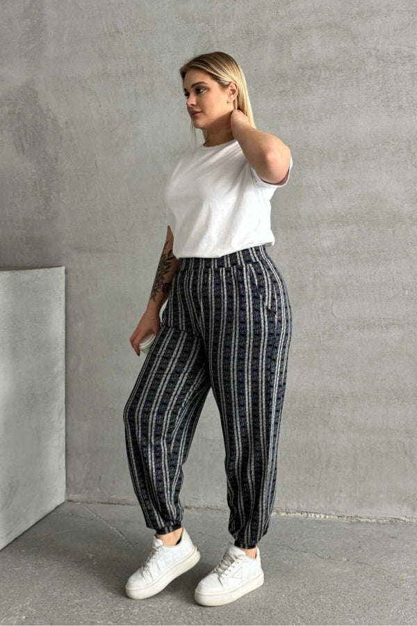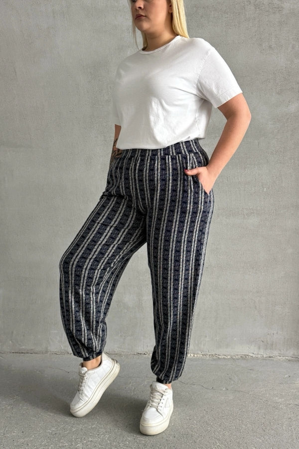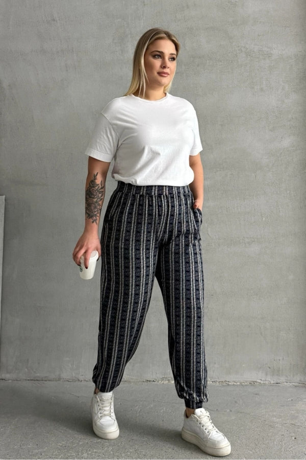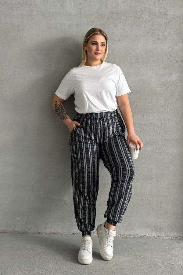 Büyük Beden Beli ve Paçası Lastikli Çizgili Cepli Pantolon 89-71