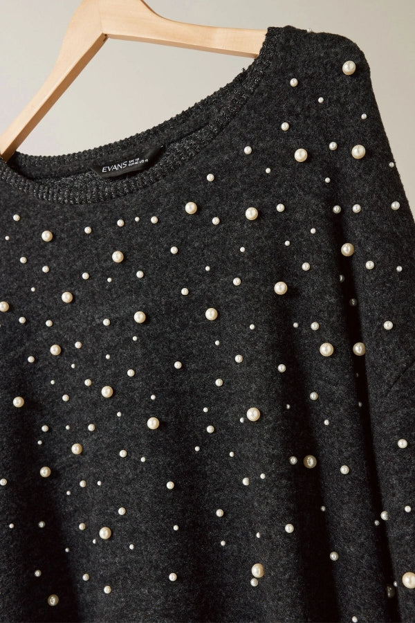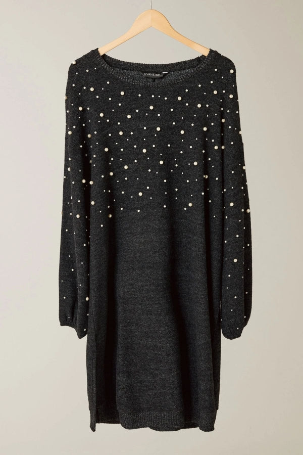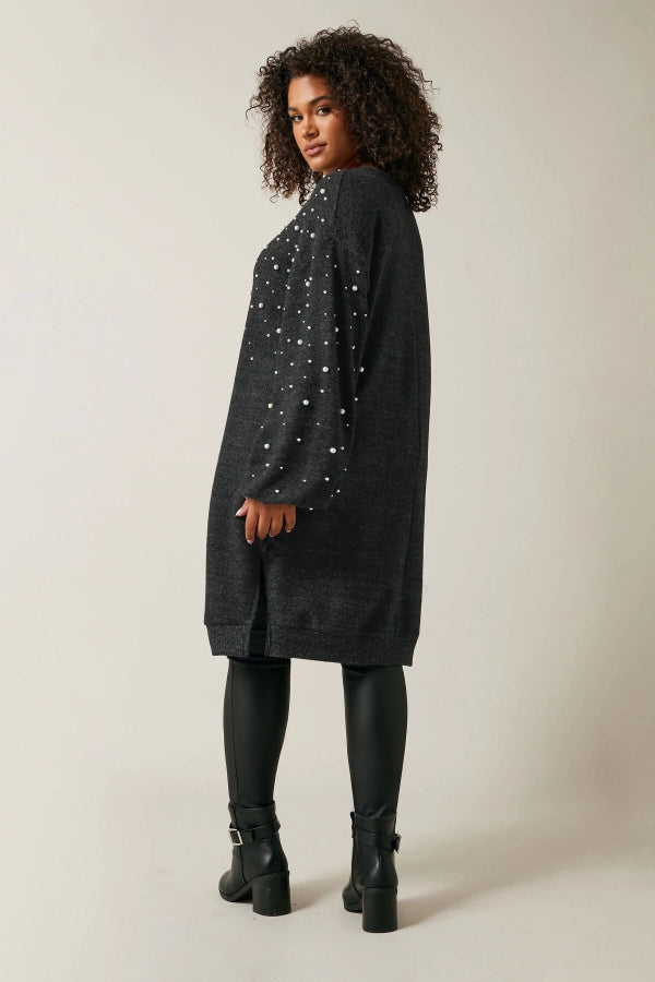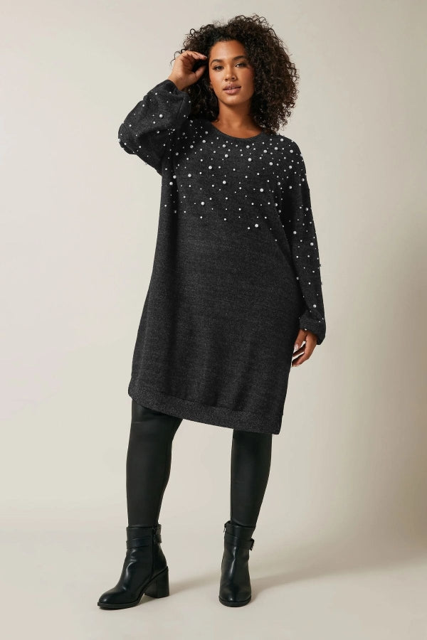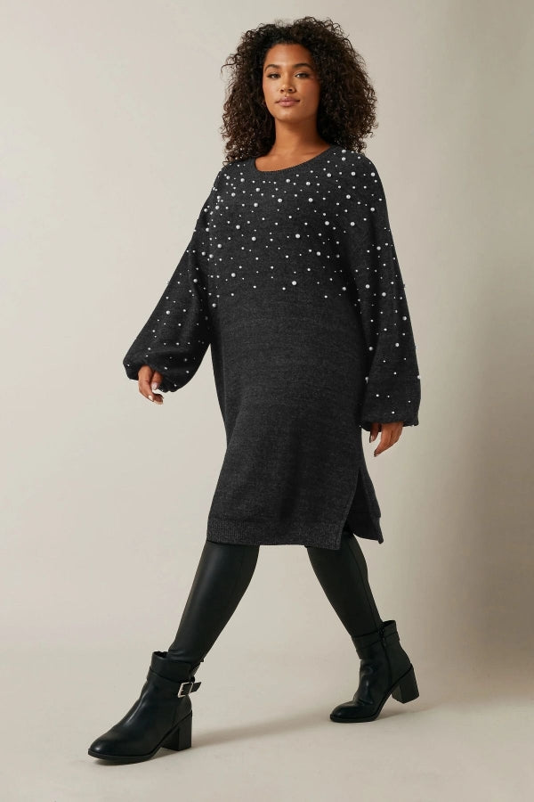 Büyük Beden Bisiklet Yaka Balon Kol Boncuk İşlemeli Triko Elbise 615670