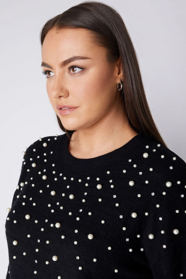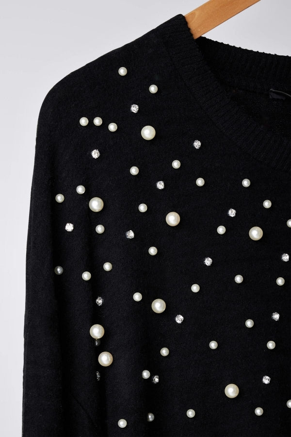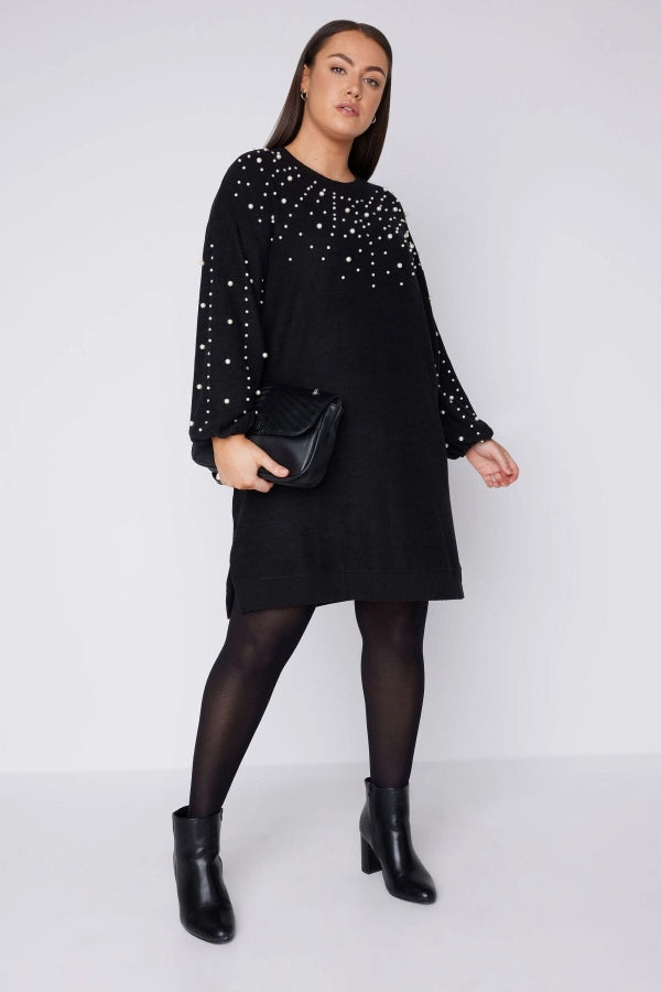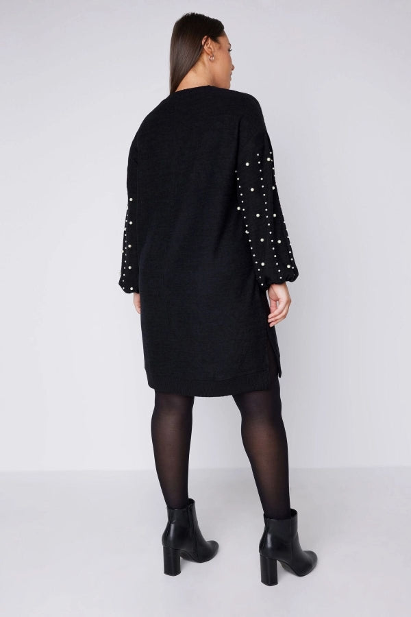 Büyük Beden Bisiklet Yaka Balon Kol İnci İşlemeli Triko Elbise 615159