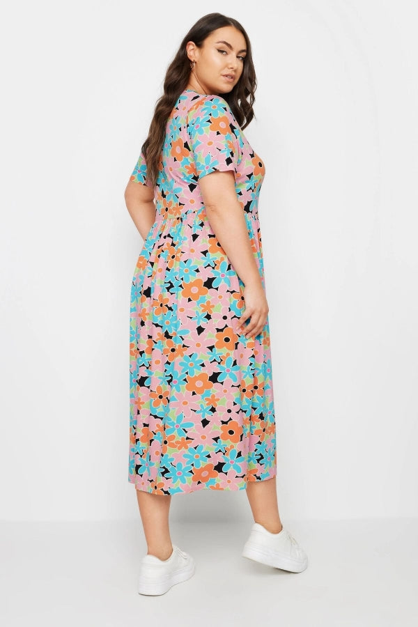 Büyük Beden Bisiklet Yaka Çiçek Desenli Midi Boy Elbise 137916