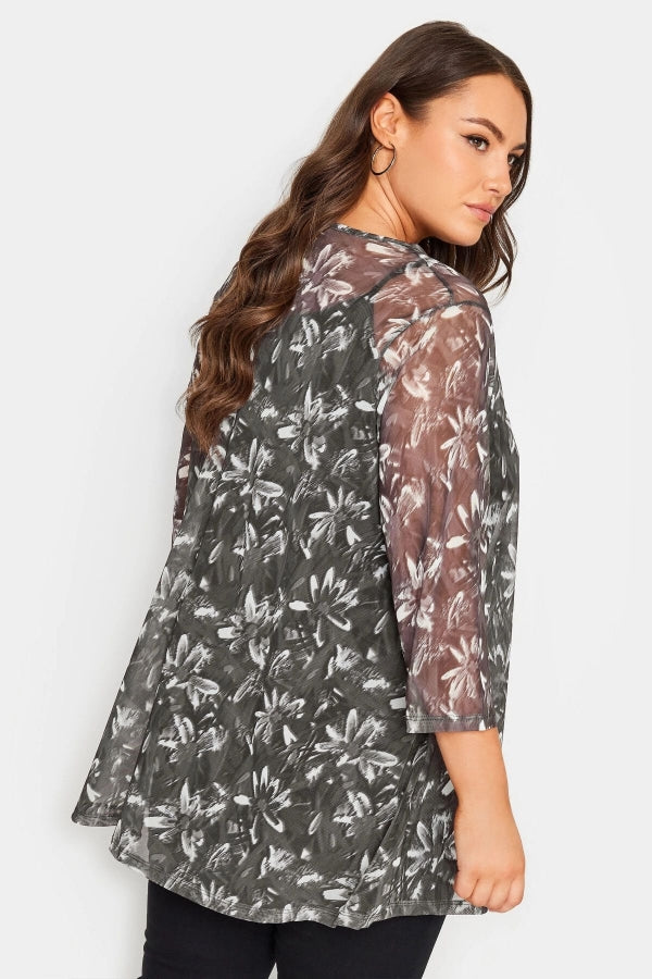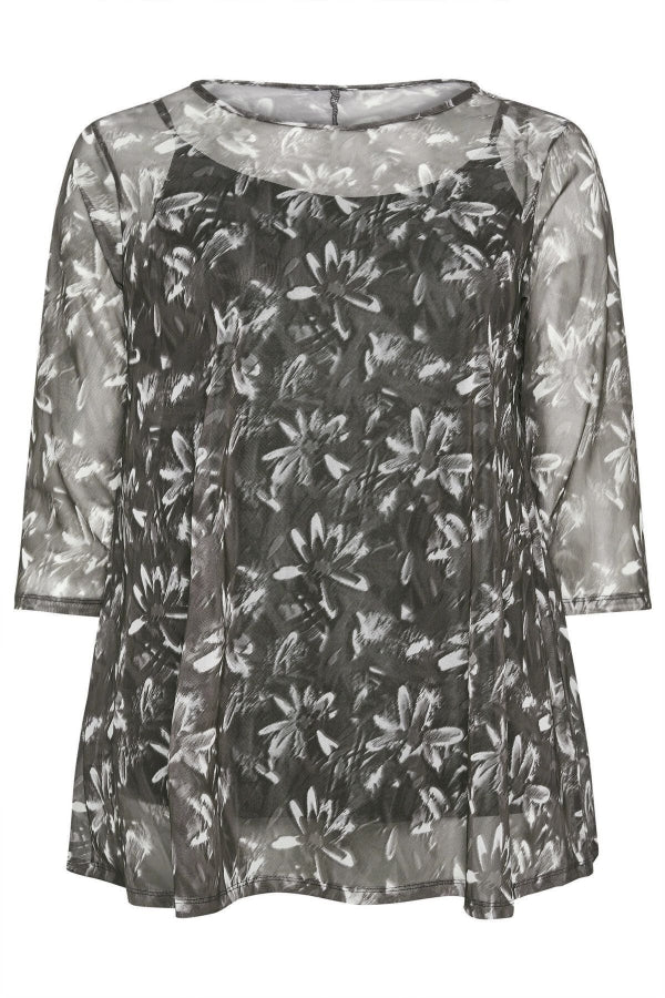 Büyük Beden Bisiklet Yaka Çiçek Desenli Uzun Kollu Tül Bluz 302701