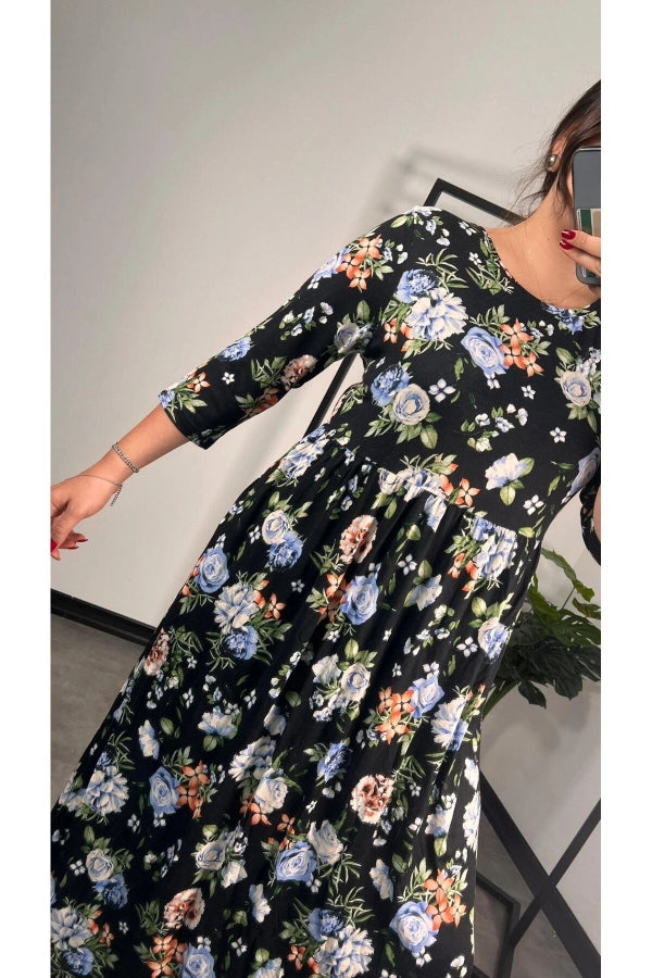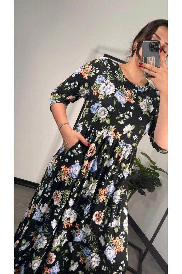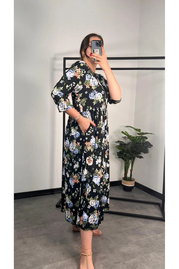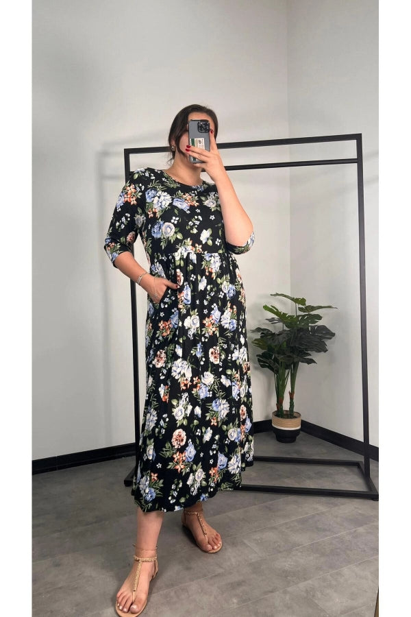 Büyük Beden Bisiklet Yaka Fakir Kol Cepli Çiçek Desenli Uzun Elbise 173306
