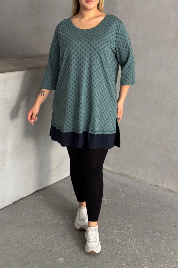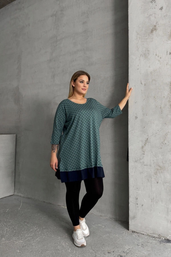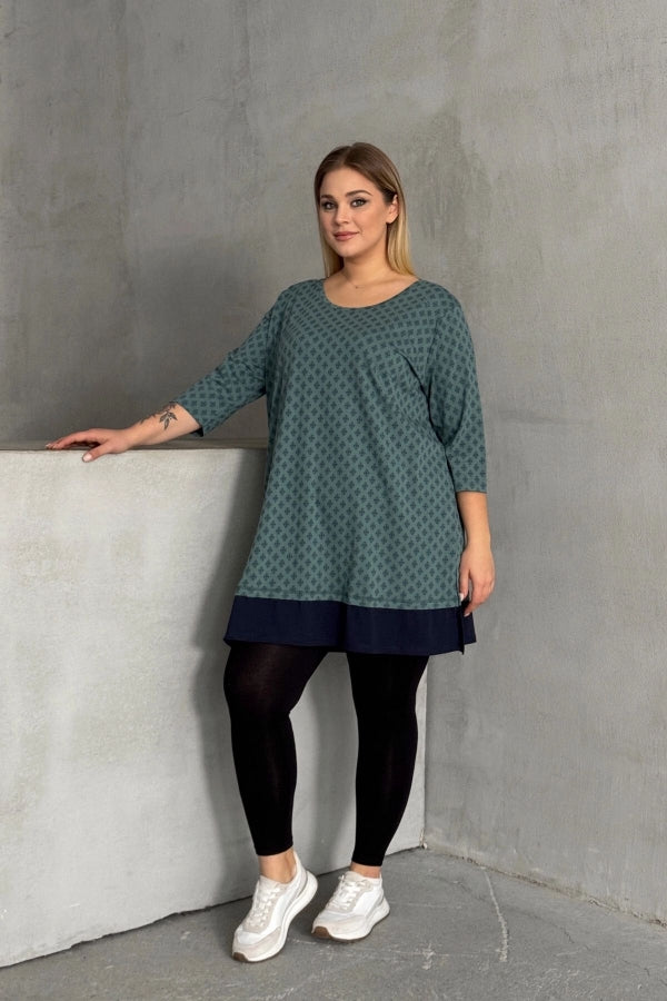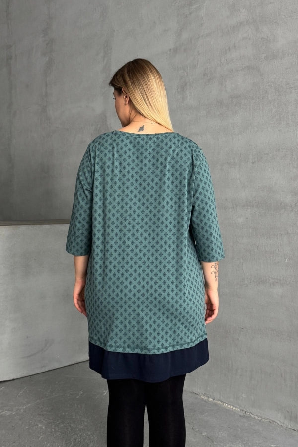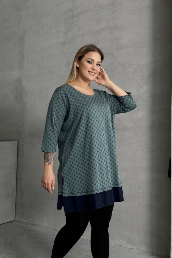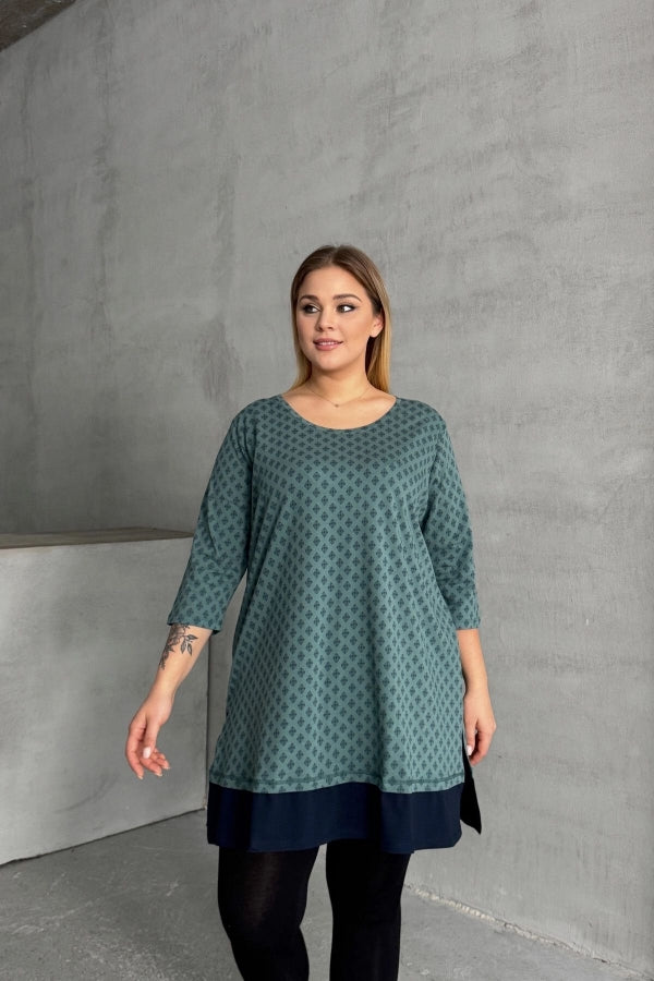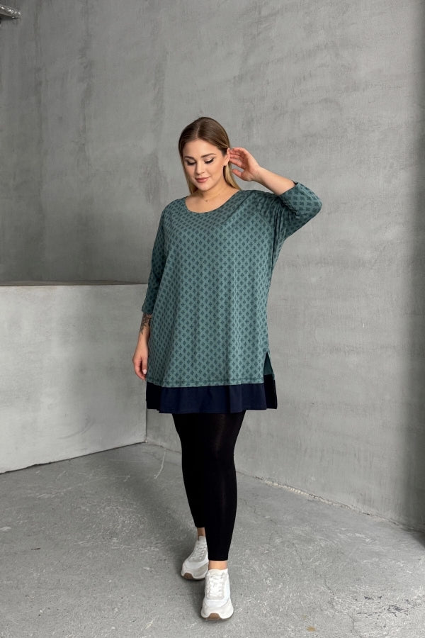 Büyük Beden Bisiklet Yaka Fakir Kol Yırtmaçlı Desenli Bluz 300400