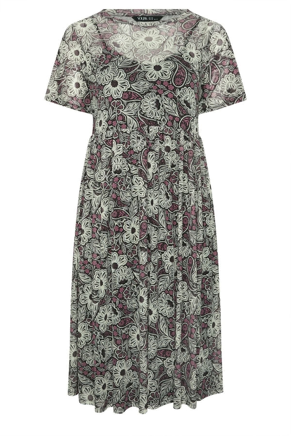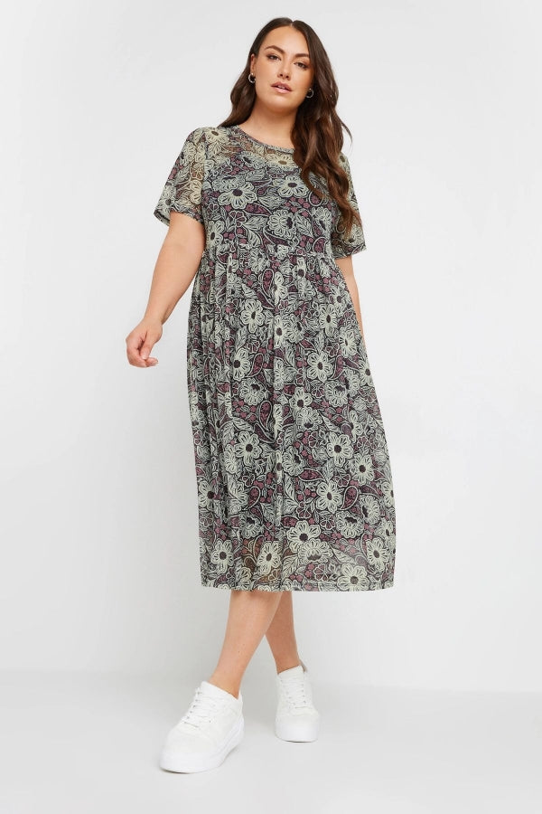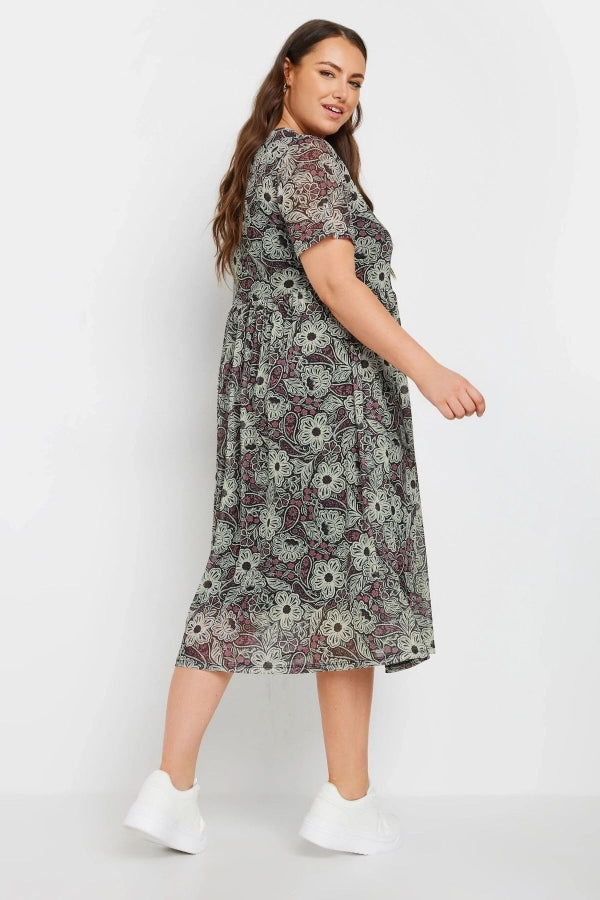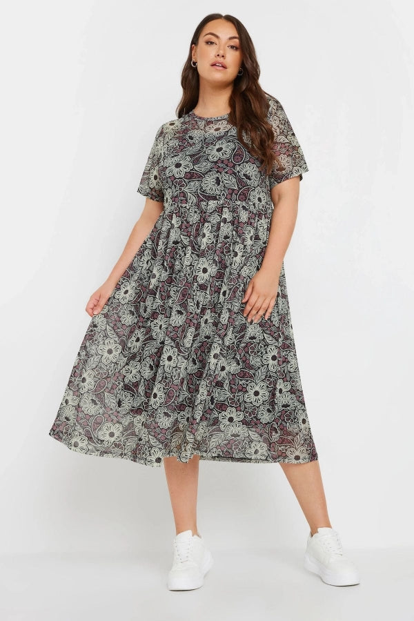 Büyük Beden Bisiklet Yaka İçi Astarlı Desenli Midi Boy Tül Elbise 137991