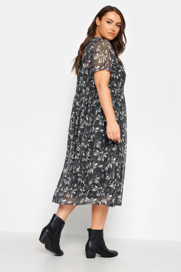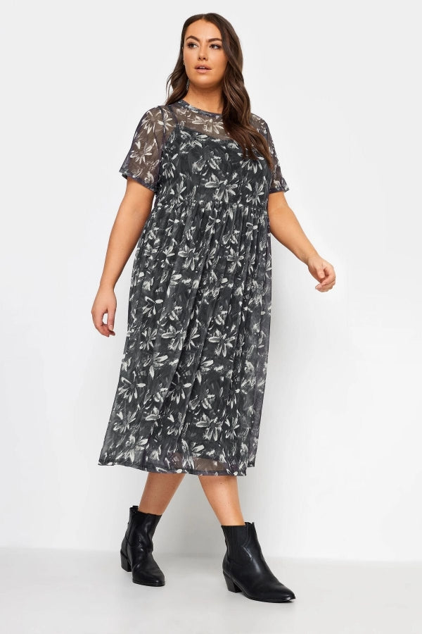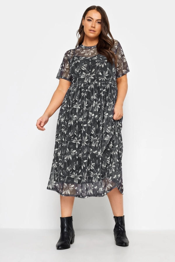 Büyük Beden Bisiklet Yaka İçi Astarlı Desenli Midi Boy Tül Elbise 302706