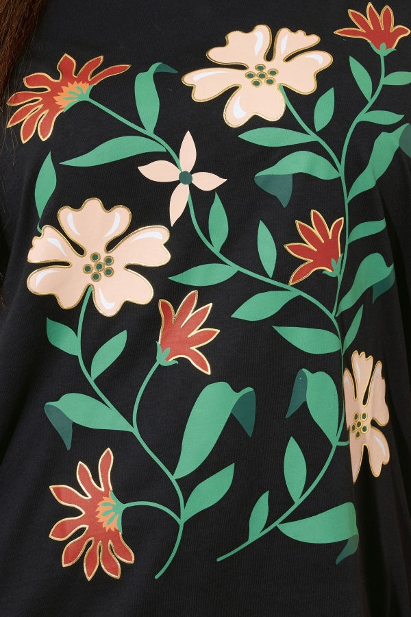 Büyük Beden Bisiklet Yaka Kısa Kollu Çiçek Desenli T-shirt 304197