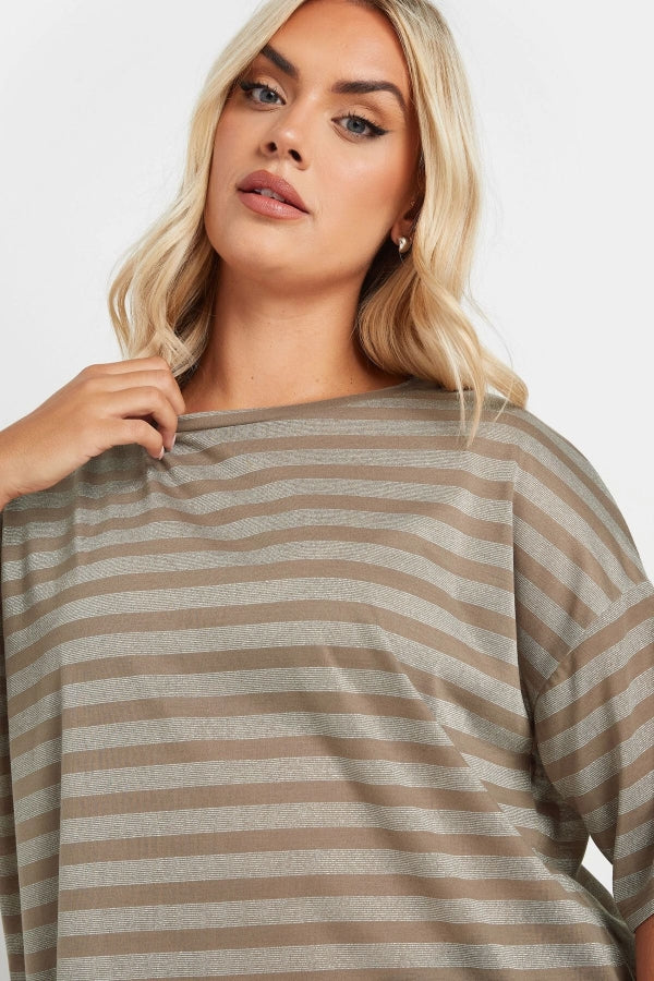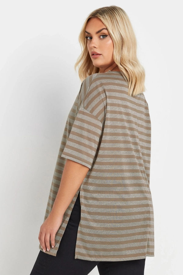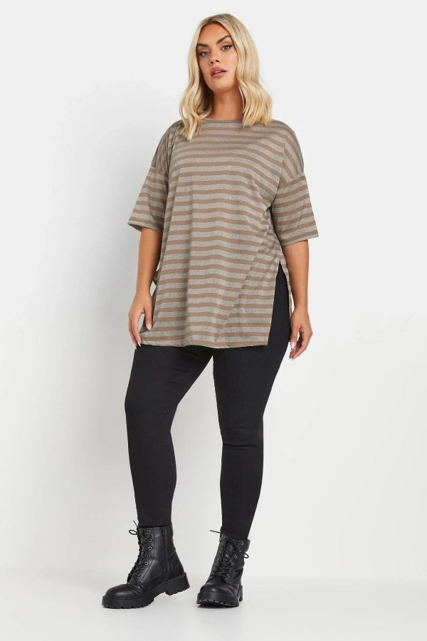 Büyük Beden Bisiklet Yaka Kısa Kollu Çizgili Yanları Yırtmaçlı T-shirt 303612