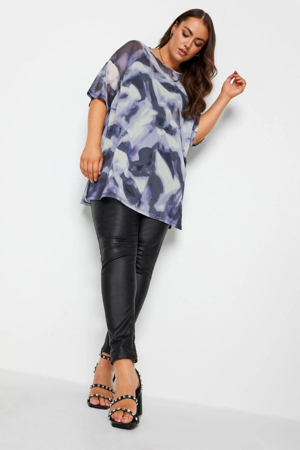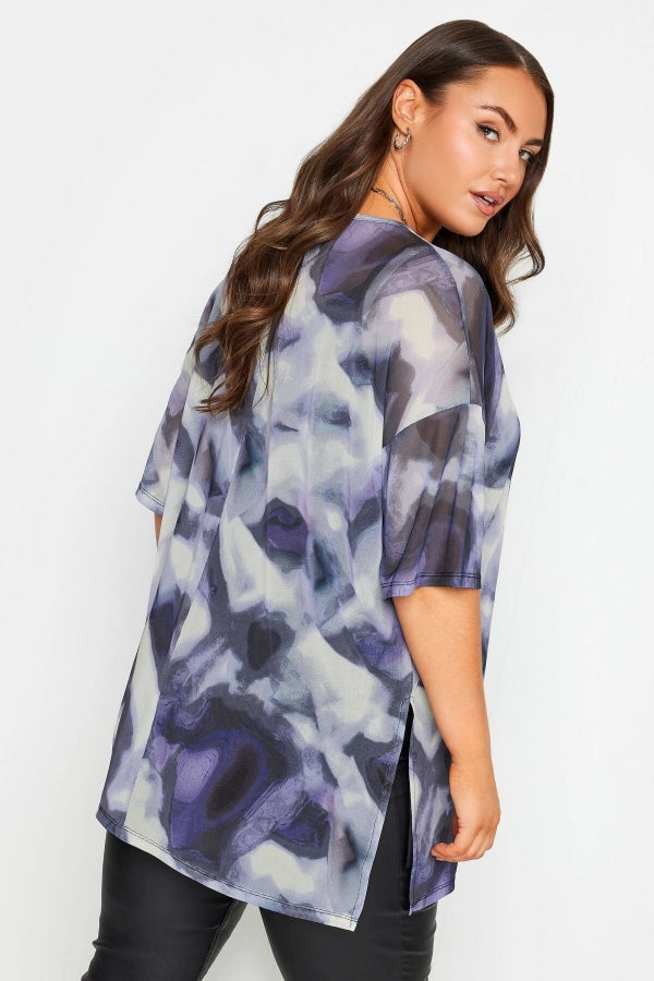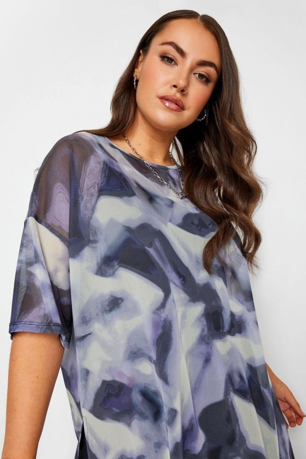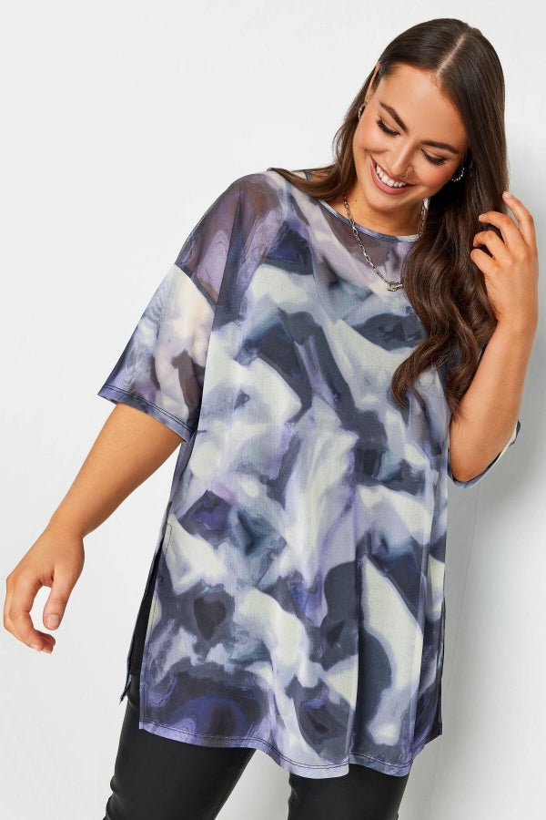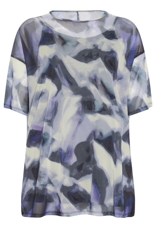 Büyük Beden Bisiklet Yaka Kısa Kollu Soyut Desenli Tül Detaylı Bluz 216066