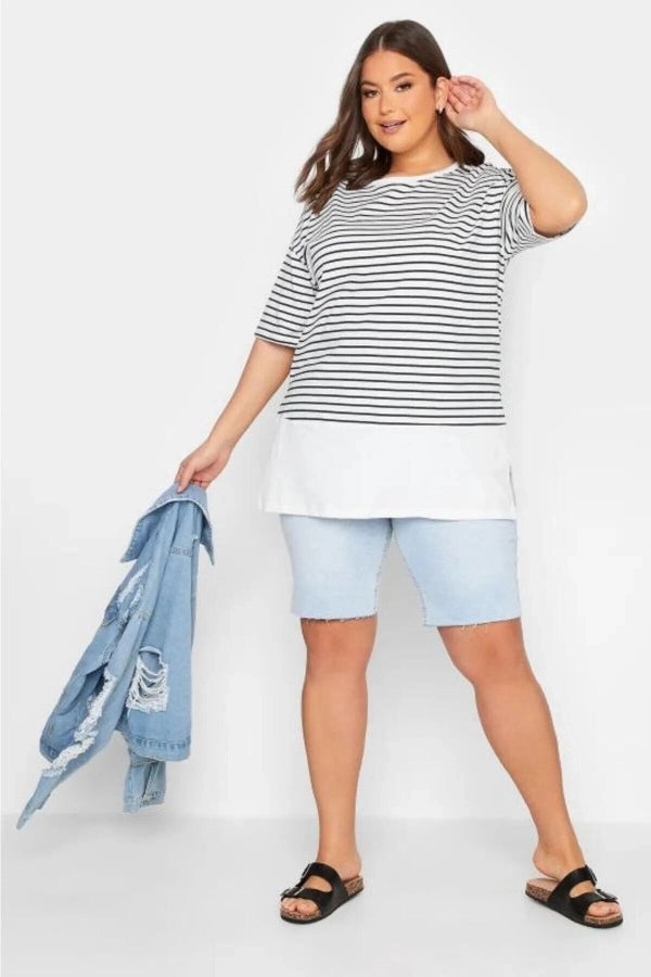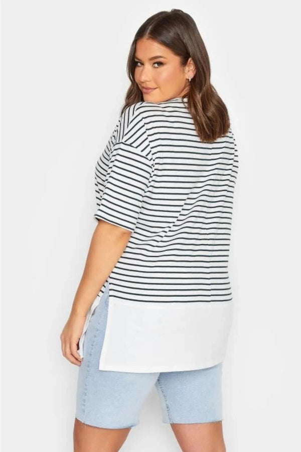 Büyük Beden Bisiklet Yaka Kısa Kollu Yırtmaç Detaylı Çizgili T-shirt 301617
