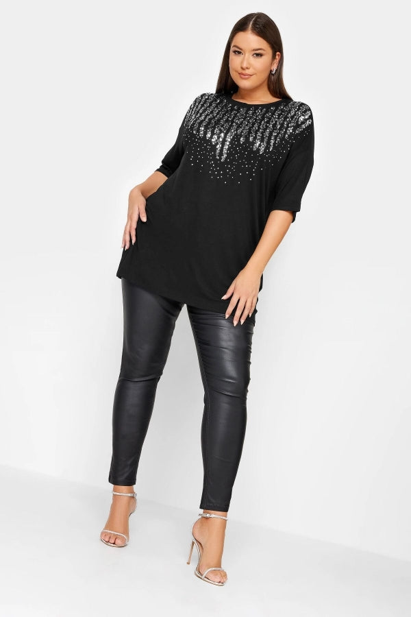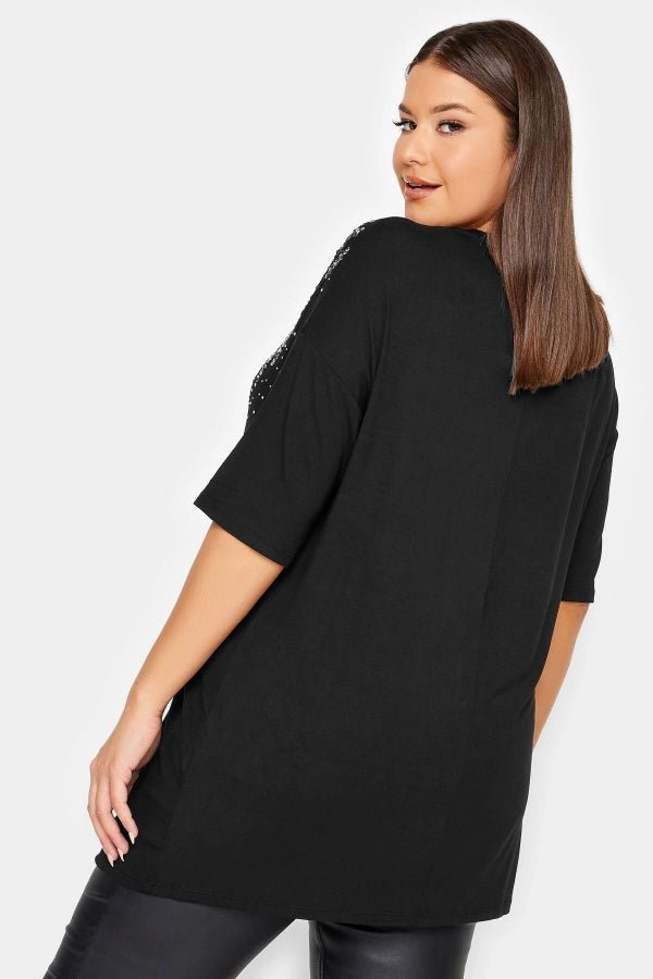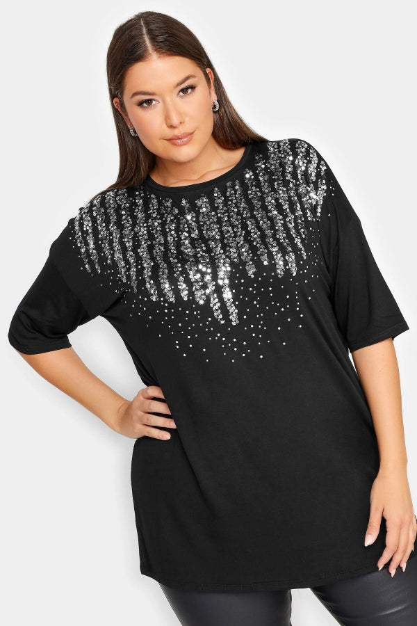 Büyük Beden Bisiklet Yaka Payet İşlemeli Kısa Kollu Bluz 302550