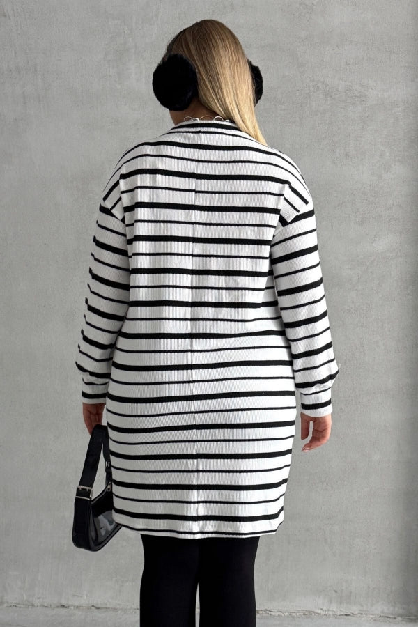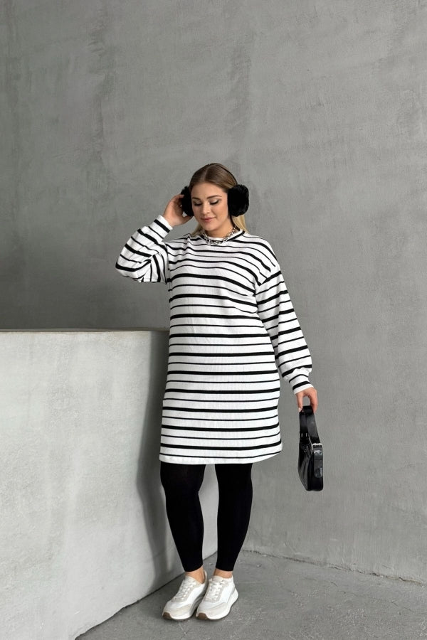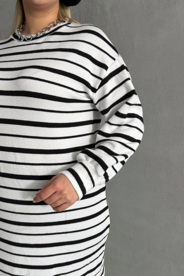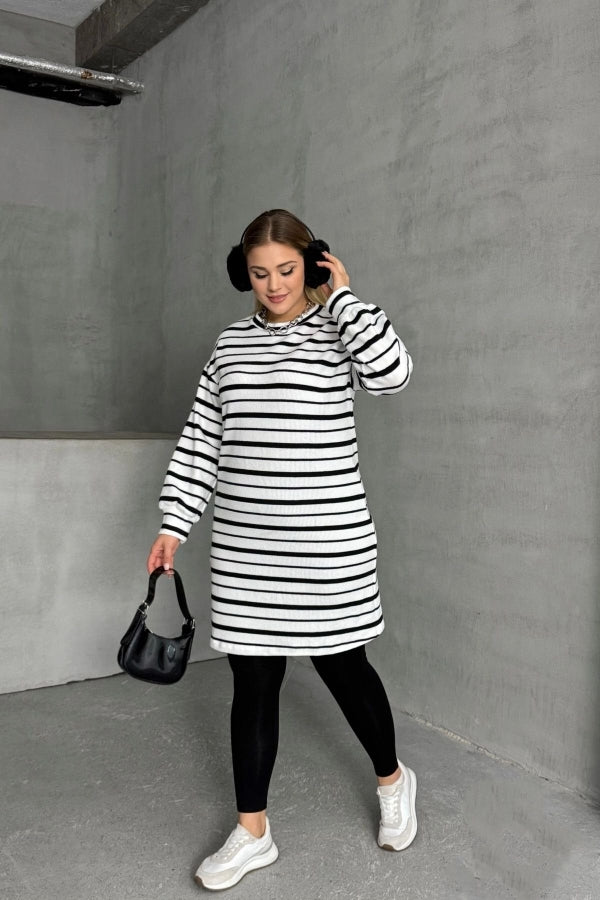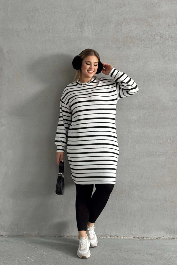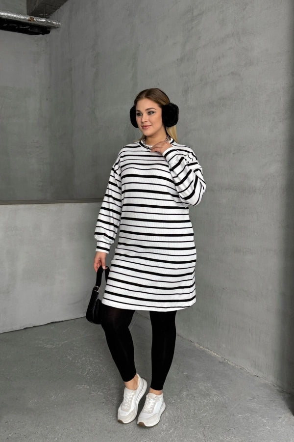 Büyük Beden Bisiklet Yaka Uzun Kollu Bileği Lastikli Çizgili Elbise 303062