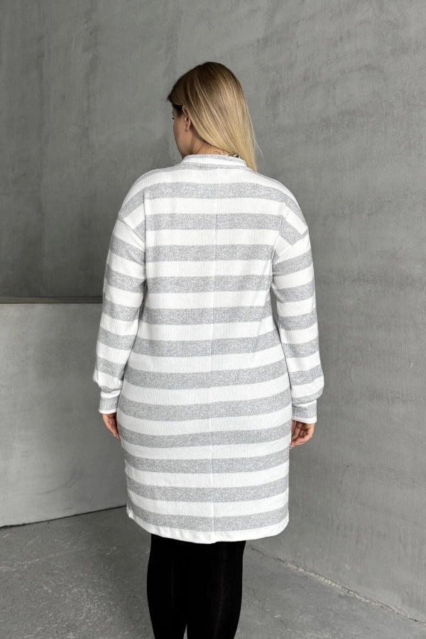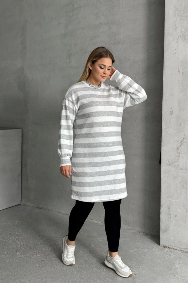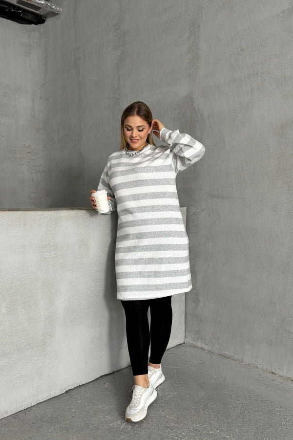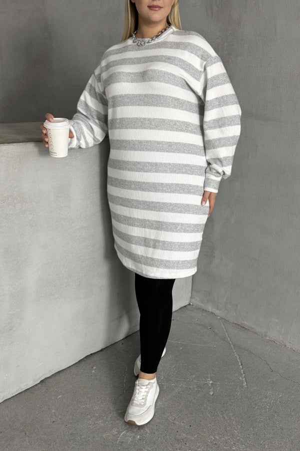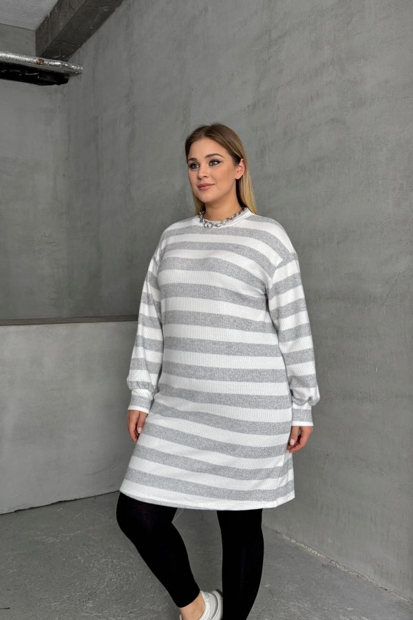 Büyük Beden Bisiklet Yaka Uzun Kollu Bileği Lastikli Çizgili Elbise 303063