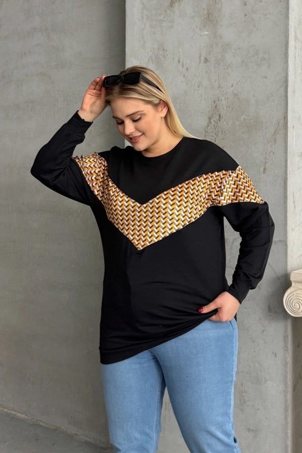 Büyük Beden Bisiklet Yaka Uzun Kollu Desenli Sweatshirt 300334