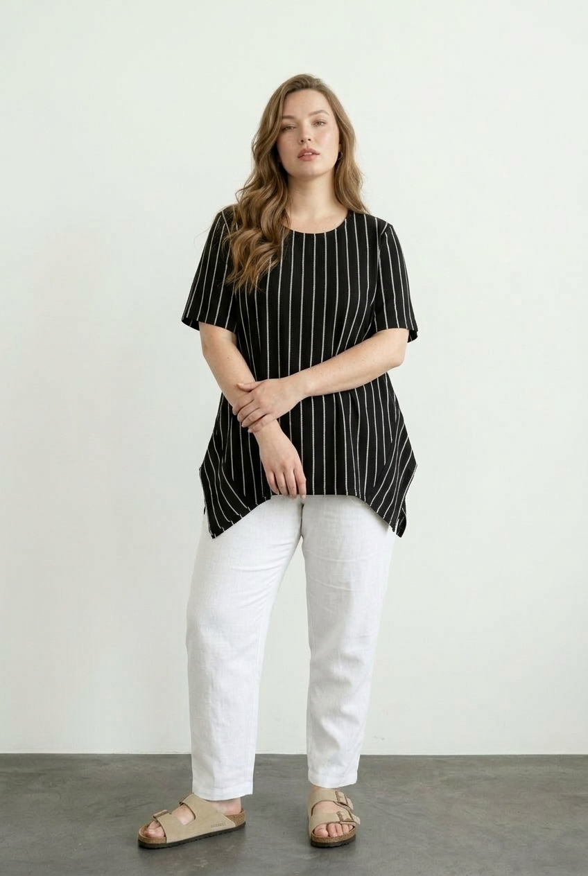 Büyük Beden Bisiklet Yaka Yarasa Kol Çizgili Asimetrik Kesim Esnek Kumaşlı T-shirt
