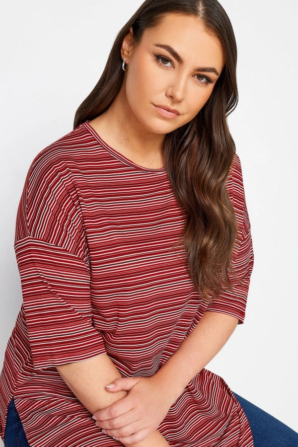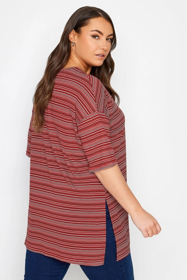 Büyük Beden Bisiklet Yaka Yarım Kollu Yırtmaç Detaylı Çizgili T-shirt 302948