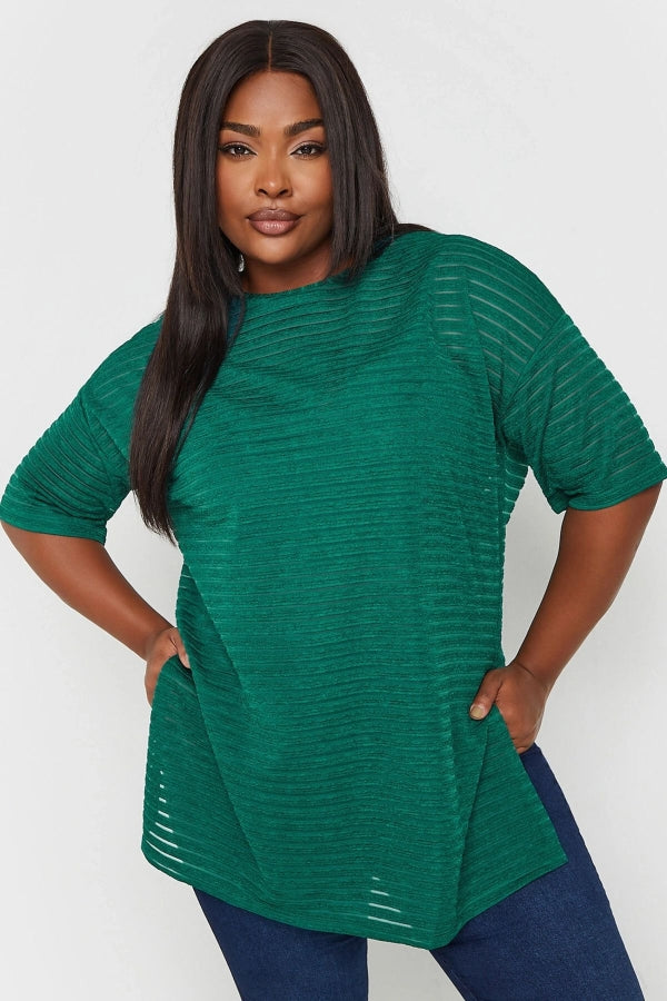 Büyük Beden Bisiklet Yaka Yarım Kollu Yırtmaçlı Çizgili File Bluz 303426