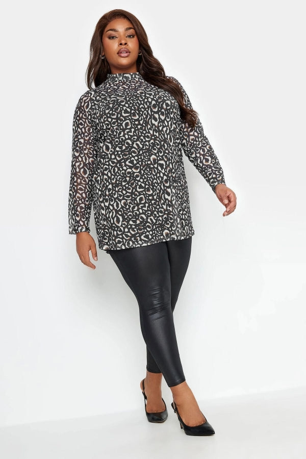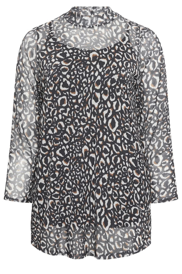 Büyük Beden Boğazlı Kolları Tül Detaylı İçi Astarlı Leopar Desenli Bluz 302698