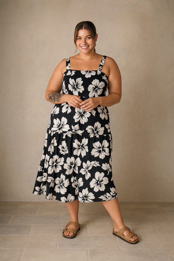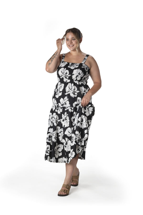 Büyük Beden Çiçek Desenli Kalın Askılı Beli Lastikli Elbise T-79