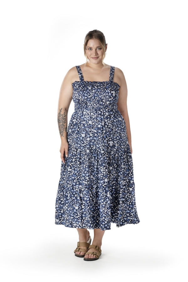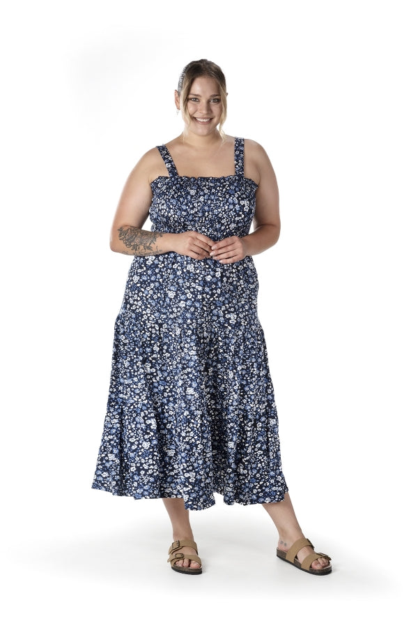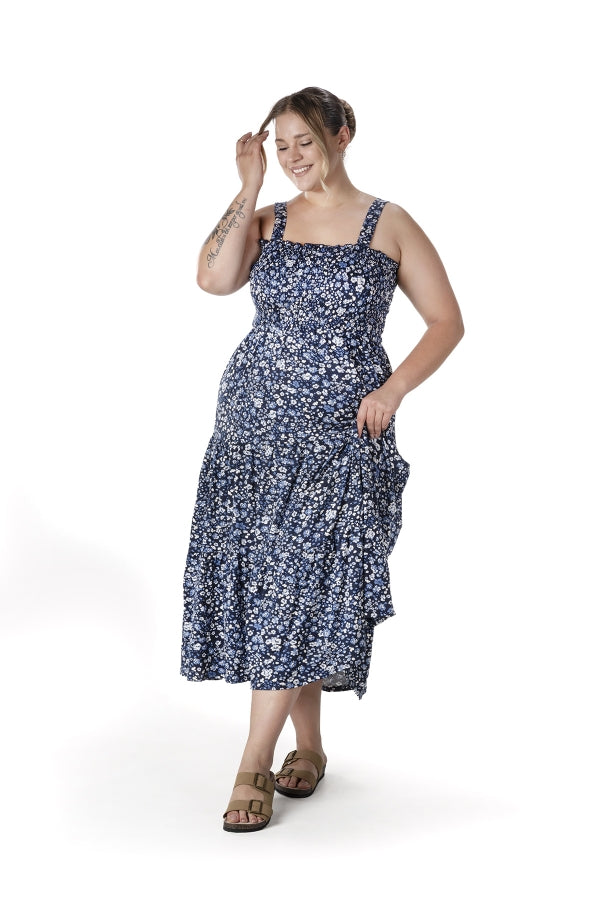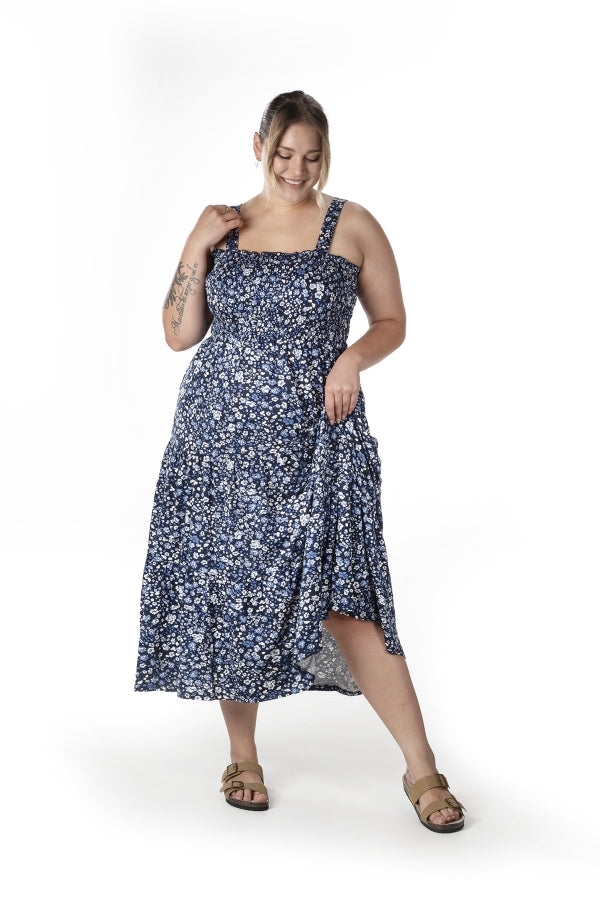 Büyük Beden Çiçek Desenli Kalın Askılı Beli Lastikli Elbise T-84