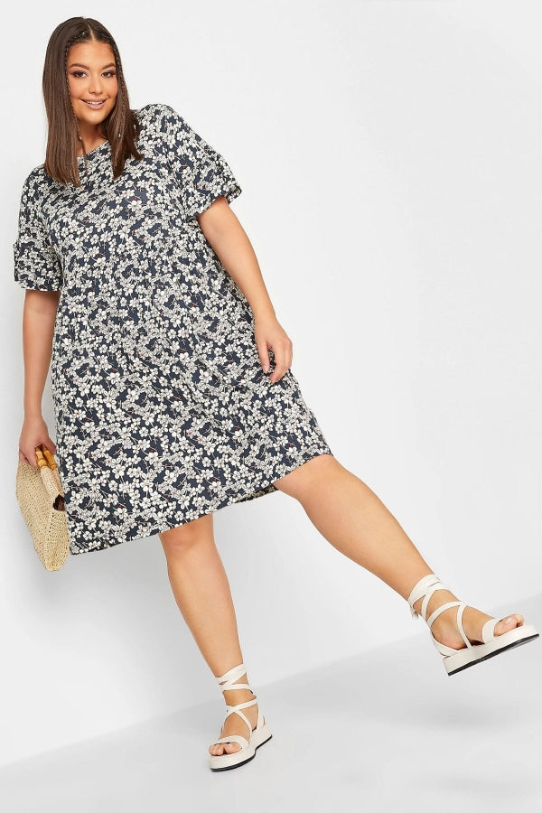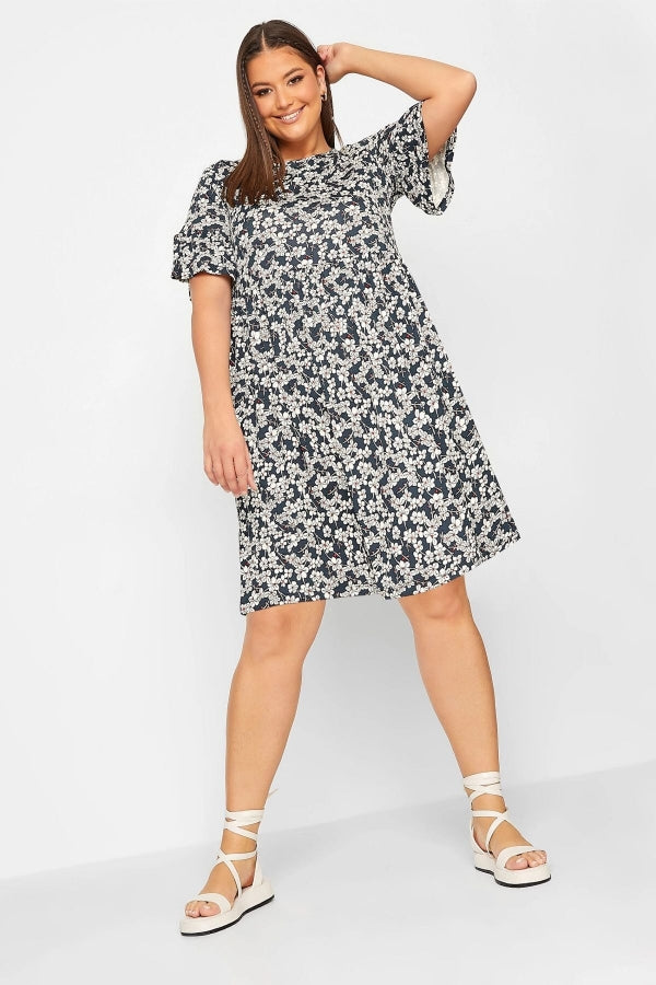 Büyük Beden Desenli Fırfırlı Yarım Kol Likralı Kısa Elbise 302358