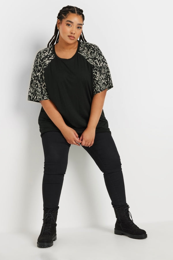 Model Detayı: U yaka (geniş yuvarlak), kısa reglan kolları soyut desenli, bedeni düz renk.