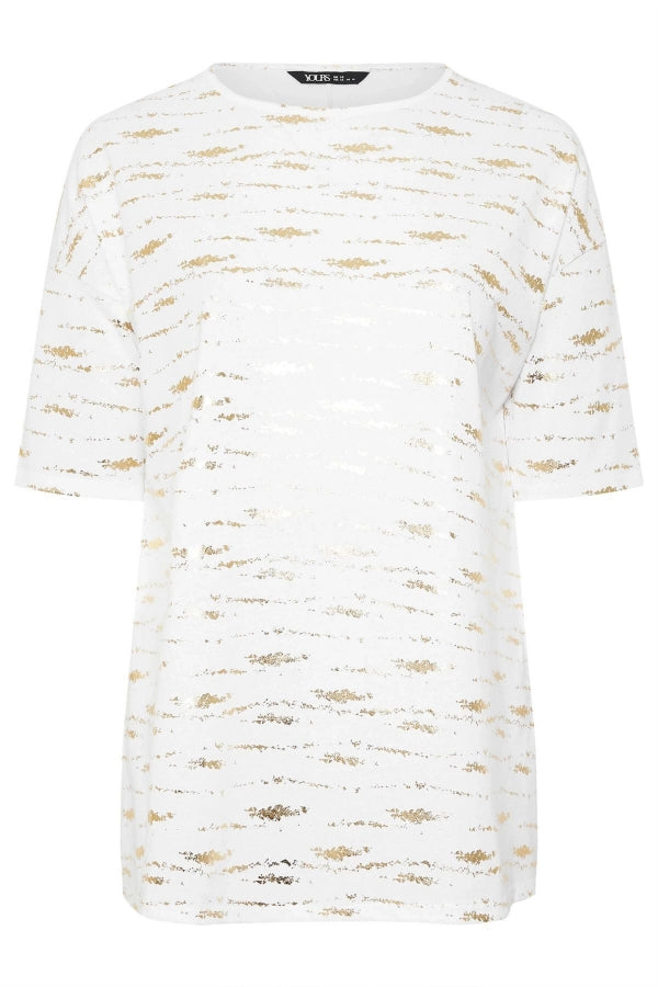 Büyük Beden Kısa Kollu Bisiklet Yaka Yanları Yırtmaçlı Metalik Baskılı T-shirt 303955
