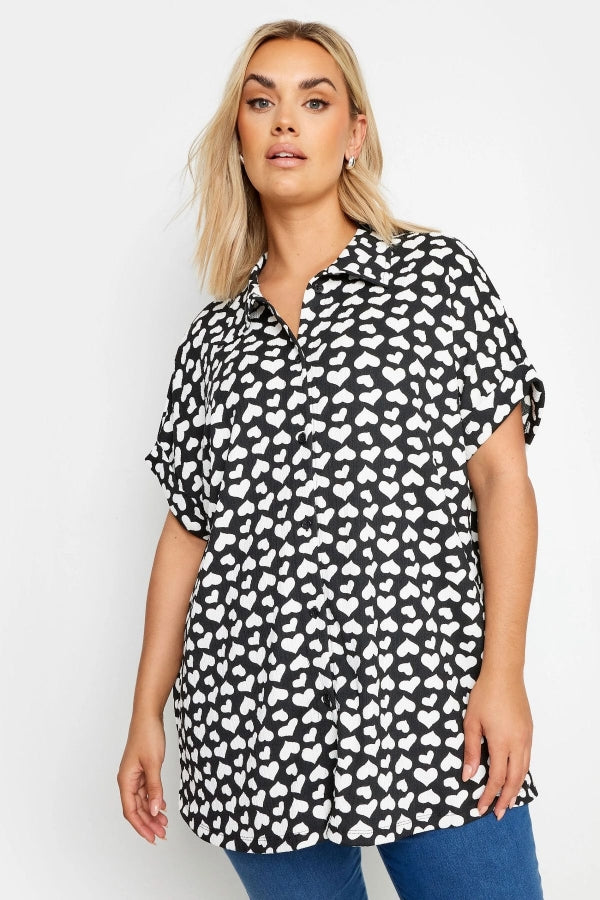 Büyük beden giyimde hem şıklığı hem de konforu bir arada sunan kısa kollu desenli düğmeli gömlek, günlük kullanımdan ofis ortamına kadar geniş bir kullanım alanı sunar. Kalp desenleriyle hareket katılan bu gömlek, klasik yaka ve önden düğmeli tasarımıyla zarif bir görünüm sağlar. Hem pantolonlarla hem de eteklerle kolayca kombinlenebilir.