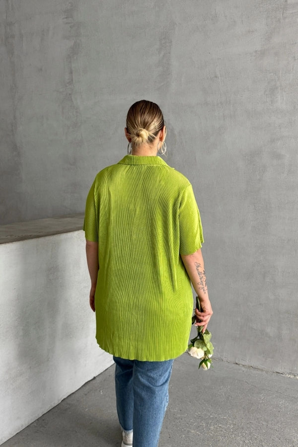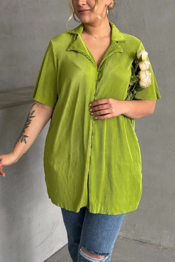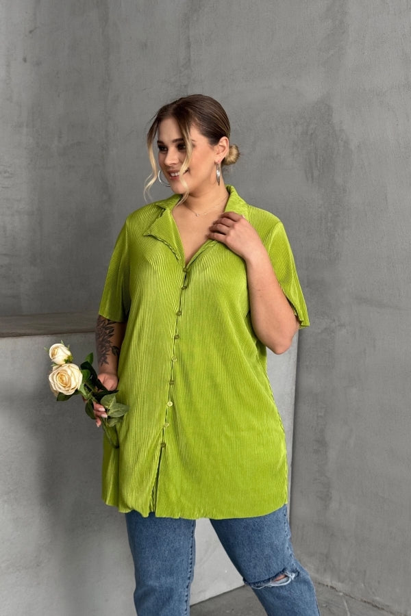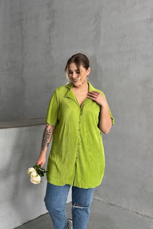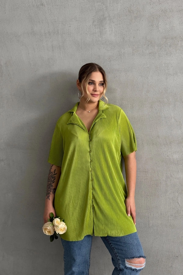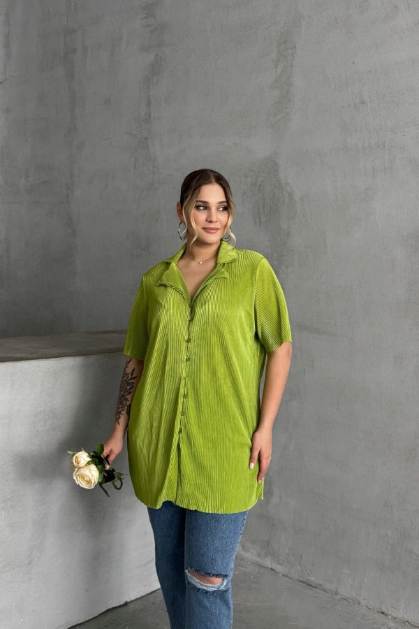 Büyük Beden Kısa Kollu Önü Düğmeli Fitilli İnce Gömlek 300738