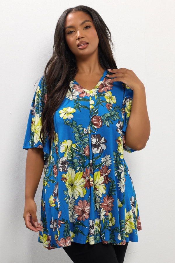 Model Detayı: Çiçek baskılı, V yaka, önü piliseli, kısa kollu, salaş (A kesim) model.