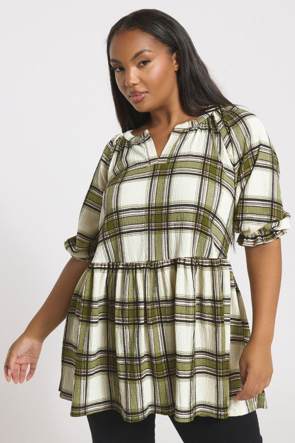 Büyük Beden Kısa Kollu V Yaka Fırfırlı Beli Lastikli Kareli T-shirt 322964