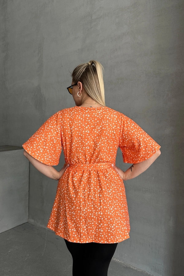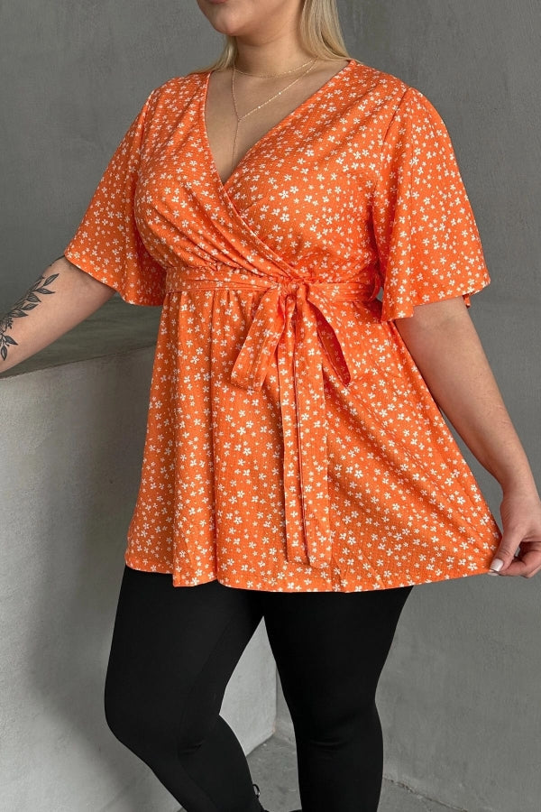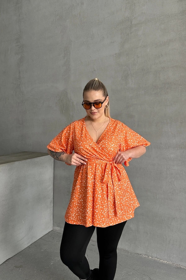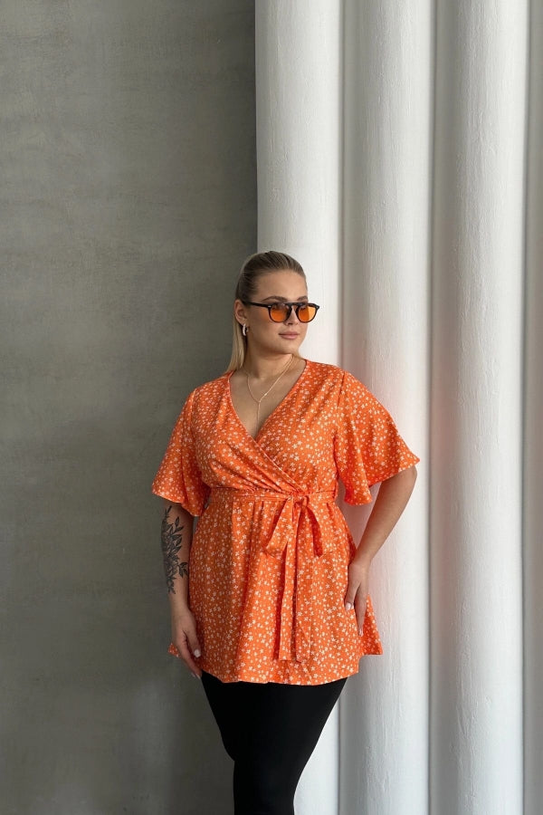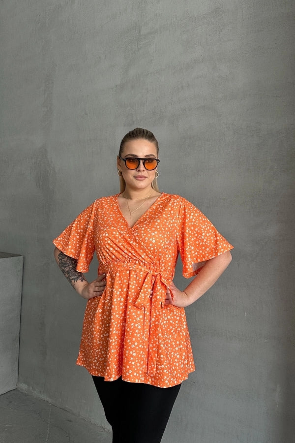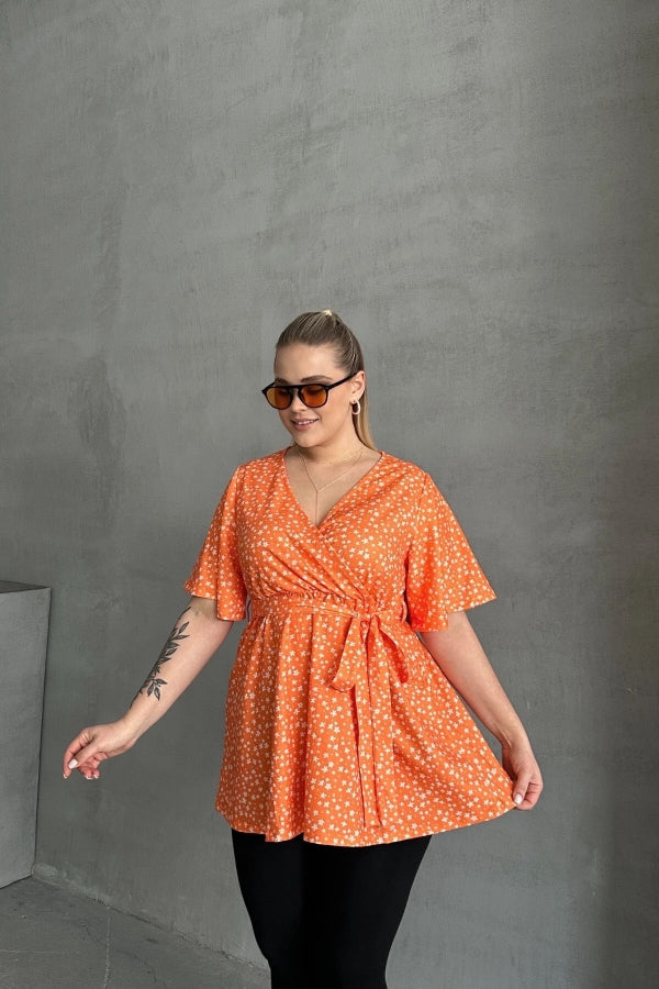 Büyük Beden Kısa Kollu V Yaka Önü Bağlama Detaylı Bluz 97-40