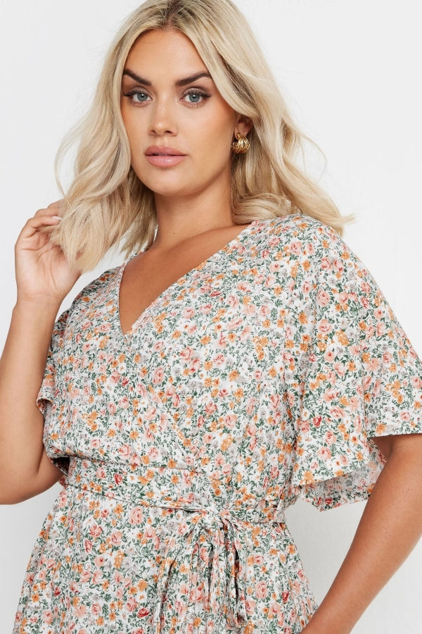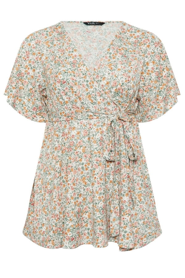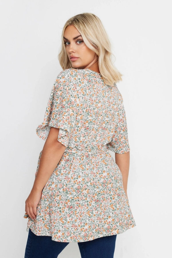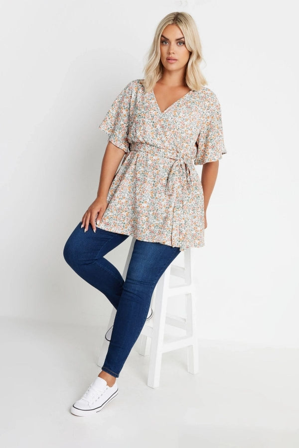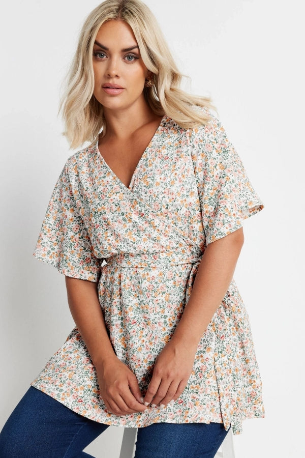 Büyük Beden Kısa Kollu V Yaka Önü Kuşaklı Desenli Eteği Bollaşan Bluz 321935