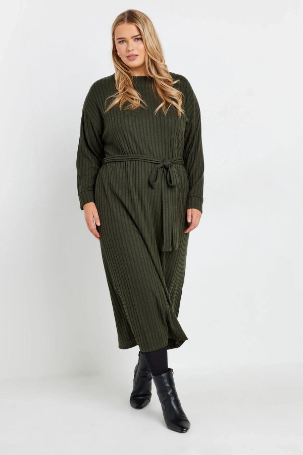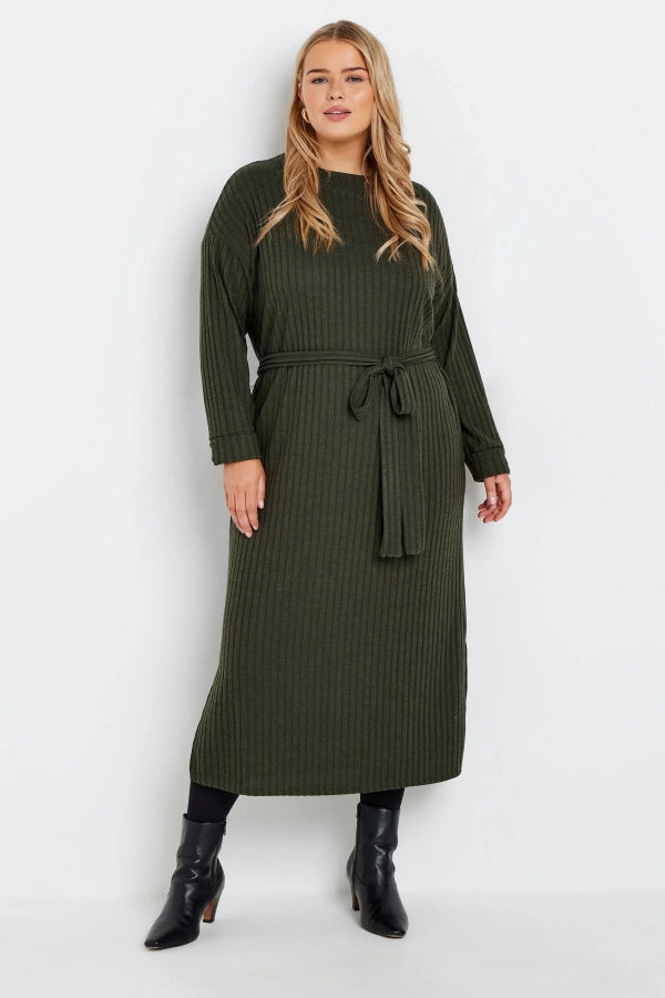 Büyük Beden Kuşaklı Düz Kesim Fitilli Uzun Kollu Astarsız Midi Elbise 322196