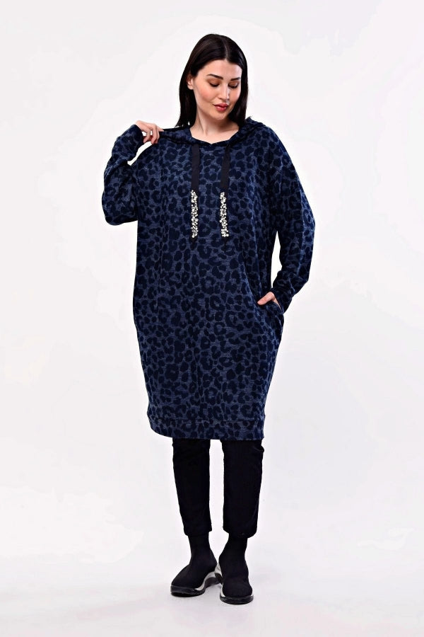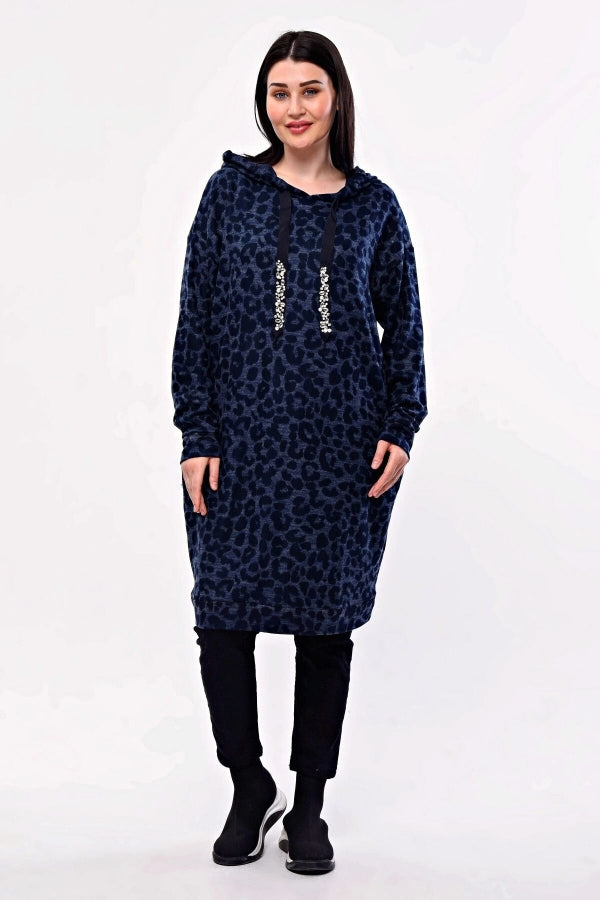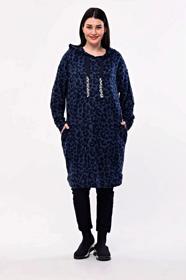 Büyük Beden Leopar Desenli Kapüşonlu Cepli Tunik 301804