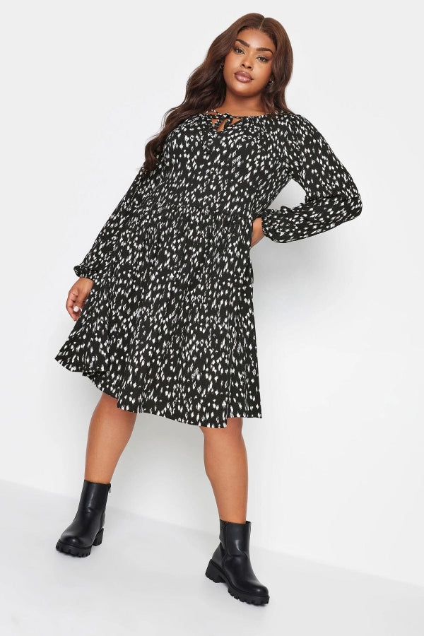 Büyük Beden Önü Bağlama Detaylı Desenli Uzun Kollu Kısa Elbise 137627