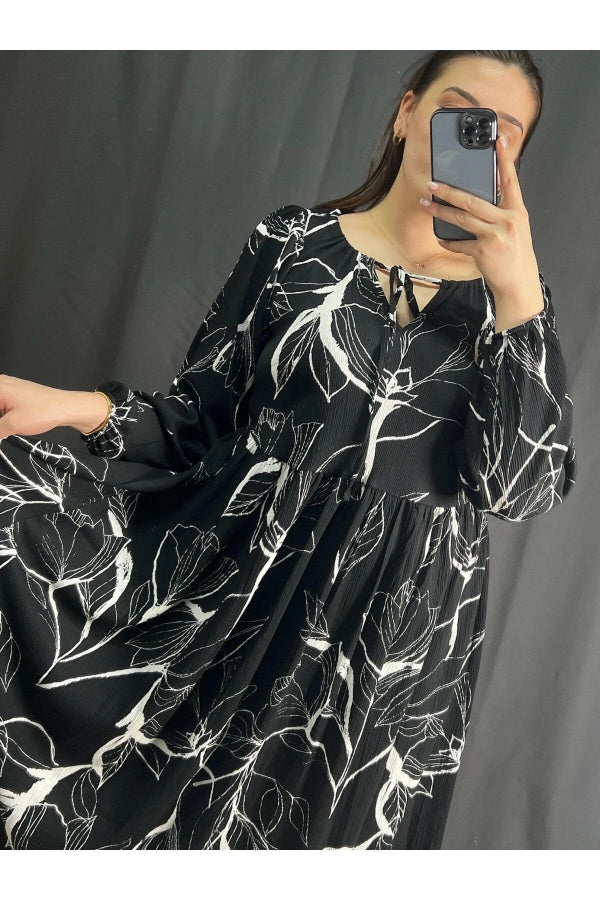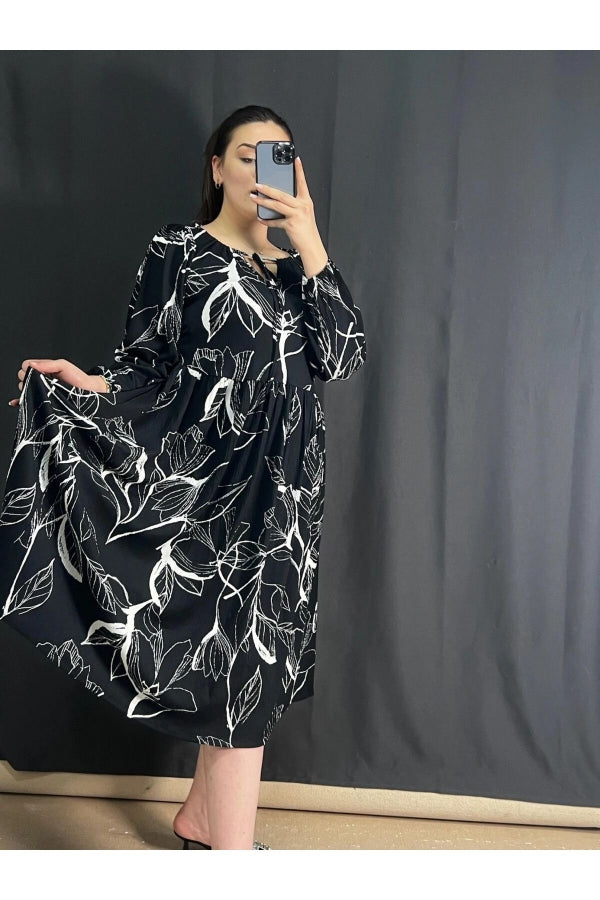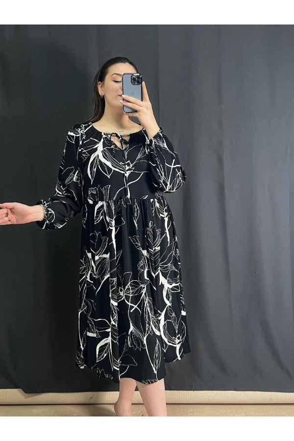 Büyük Beden Önü Bağlamalı Desenli Uzun Kollu Midi Elbise 302741