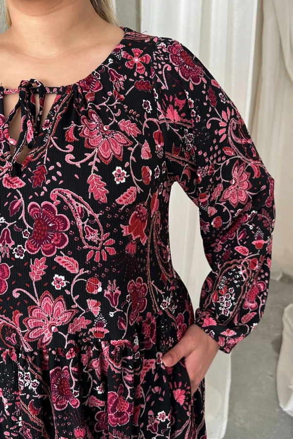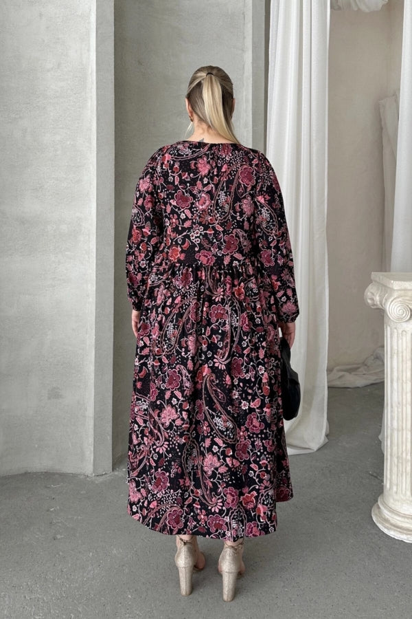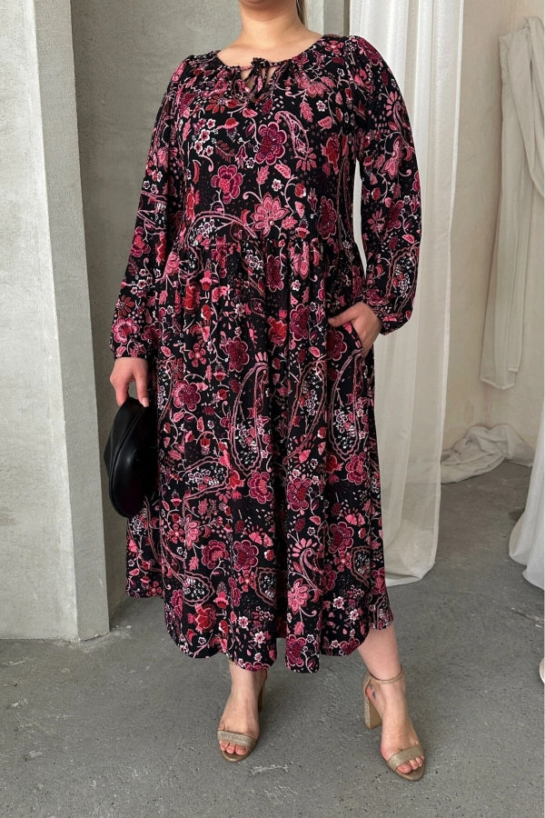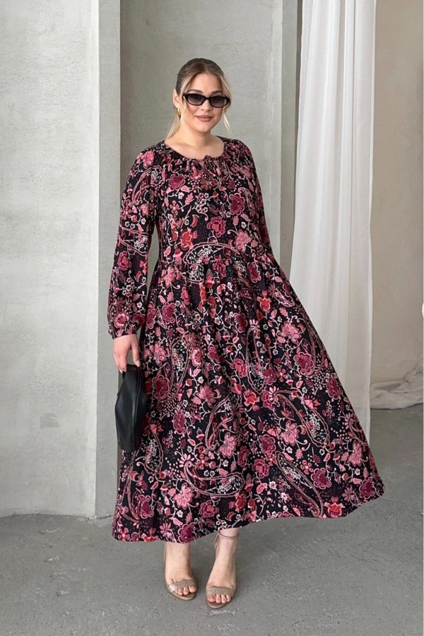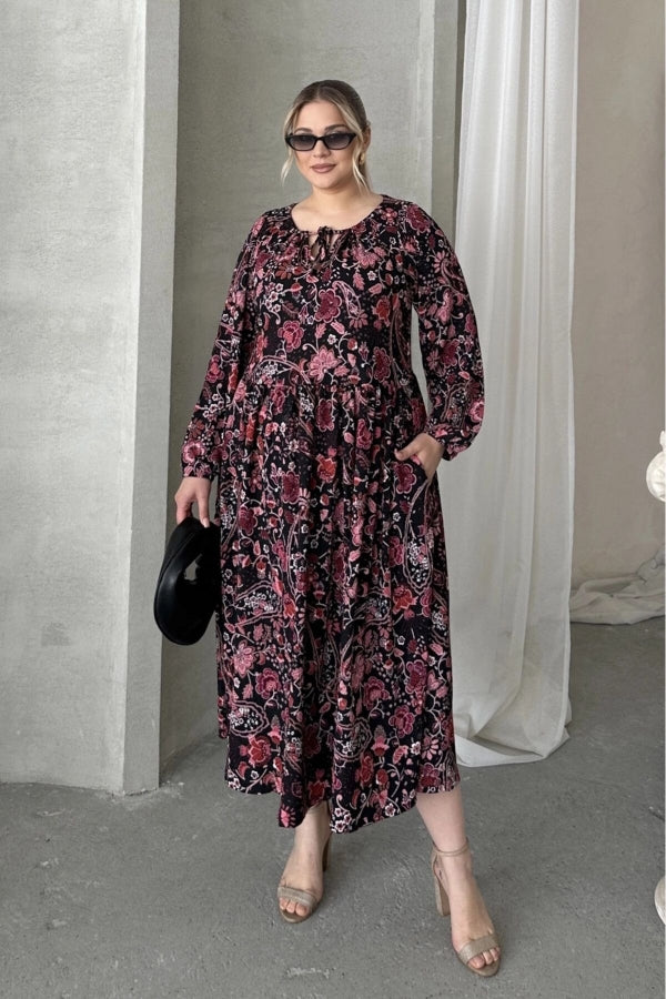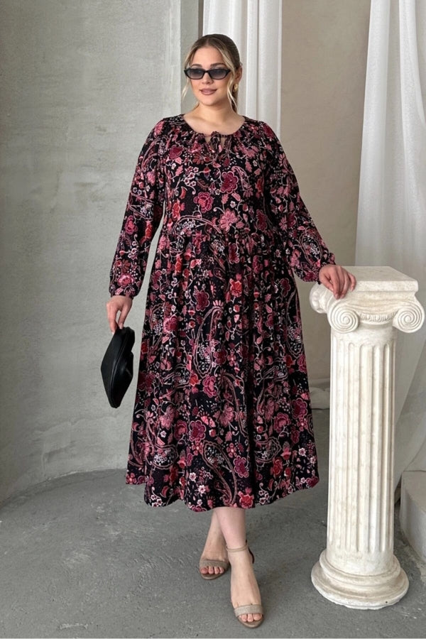 Büyük Beden Önü Bağlamalı Desenli Uzun Kollu Midi Elbise 615699